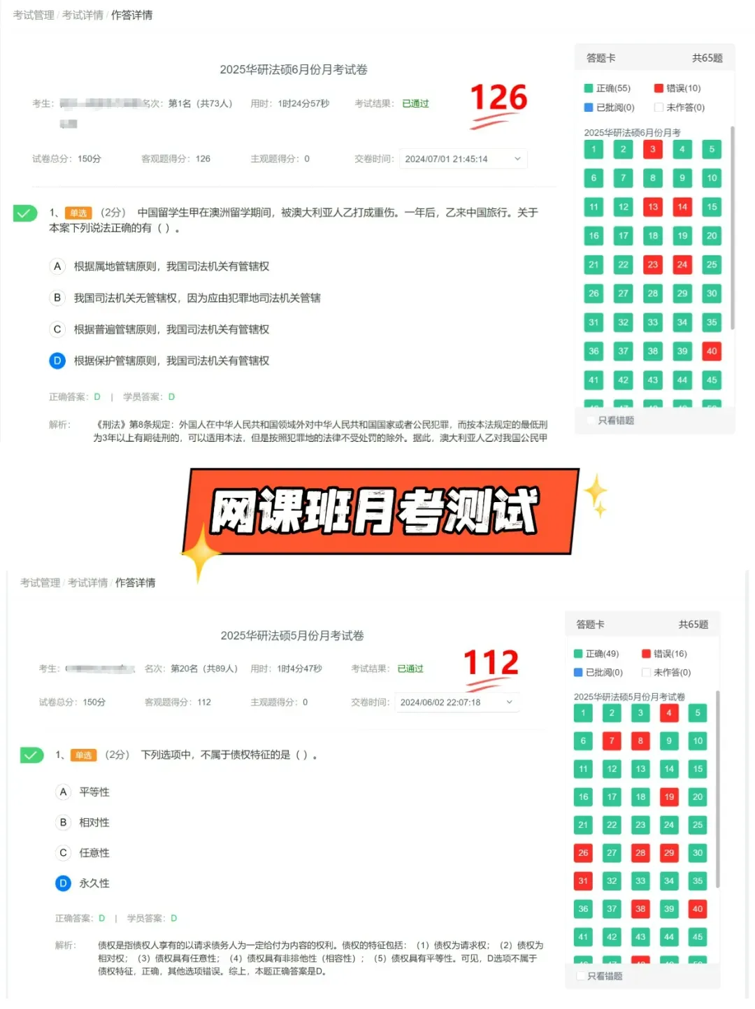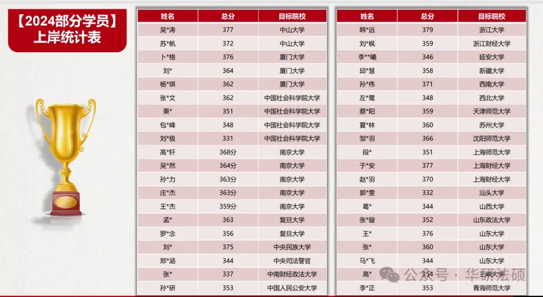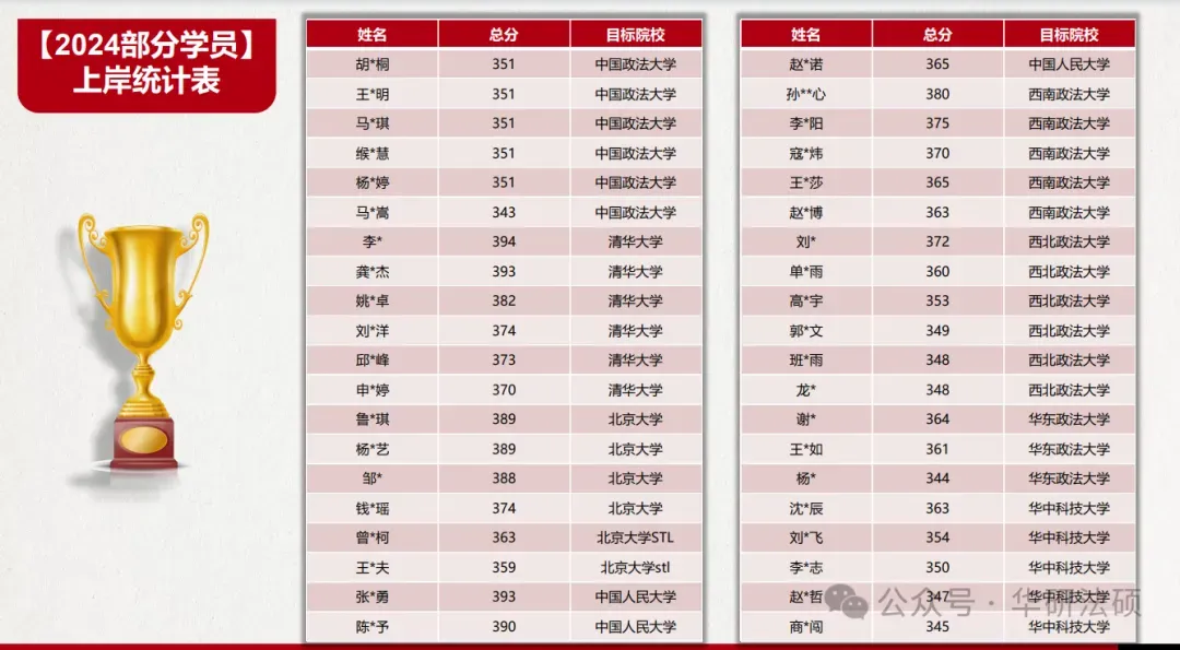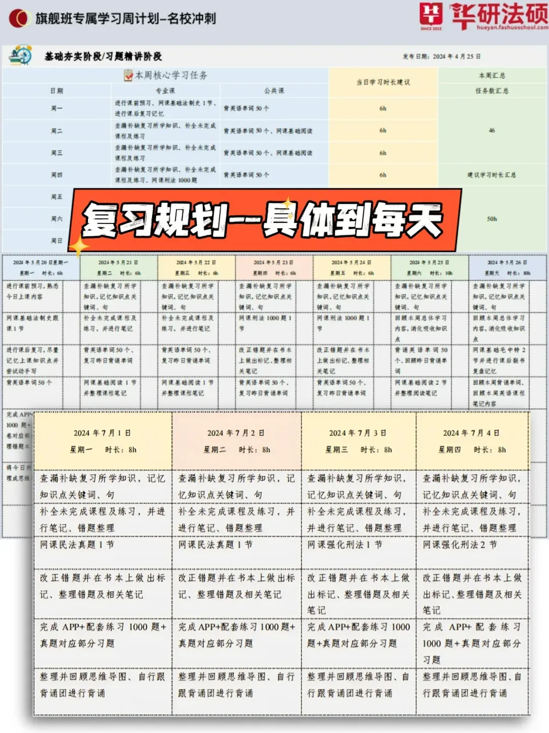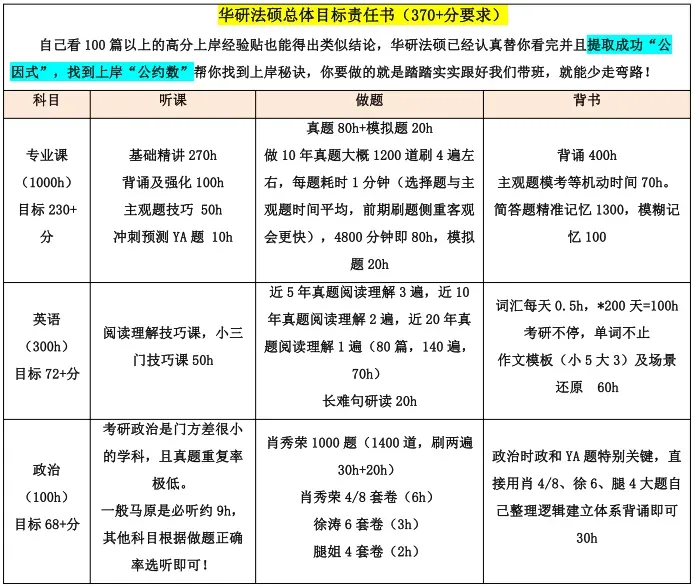 我们按照最高标准清华北大等王牌院校370+分数,根据348名高分成功上岸学员的学习成长轨迹,结合最近三年华研法硕4521名学员的带班经验,制定出一战式定量化学习规划,告诉您什么样的行为方式有利于精准考取理想院校。