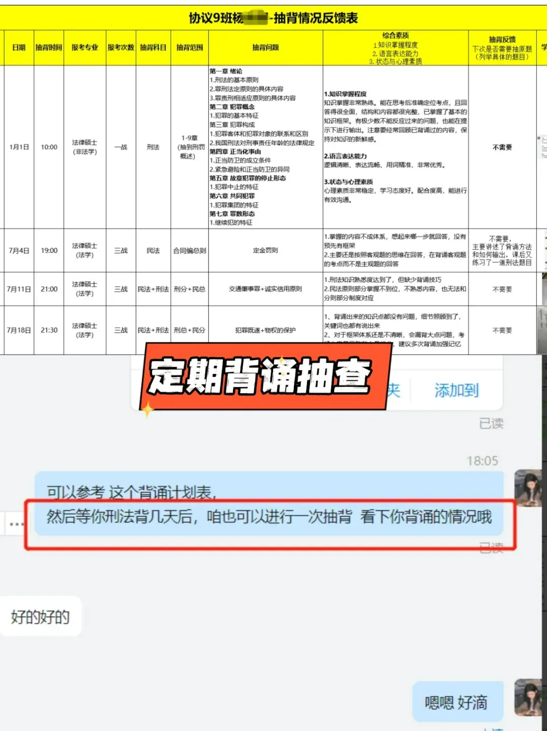 法硕专业的备考特点就是背的内容多,法基是理解运用再背诵,法综70%要求背诵,像宪法考的非常细,需要背更多的细节,那么为了更好的提高背诵进度和背诵质量,特设此服务。抽背服务是不定时的,根据学员的学习情况来进行。