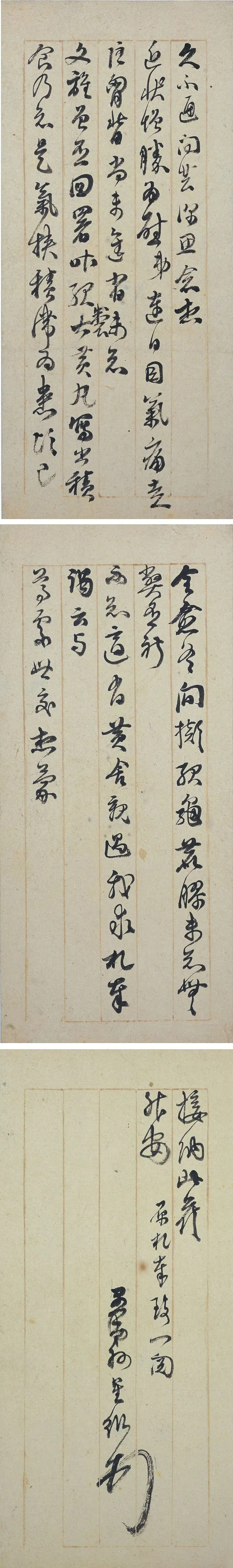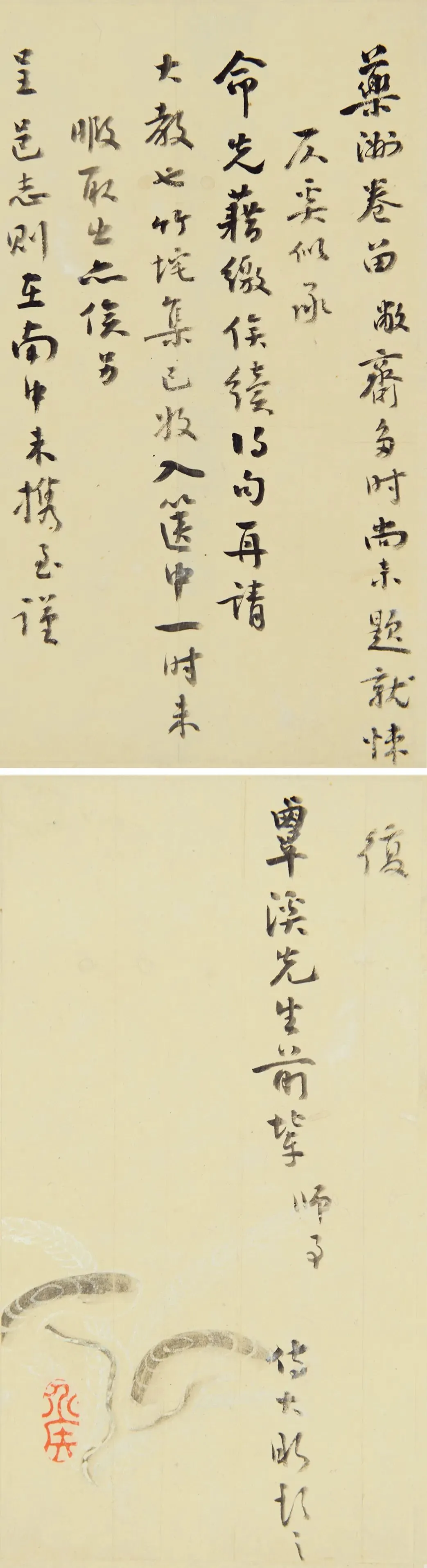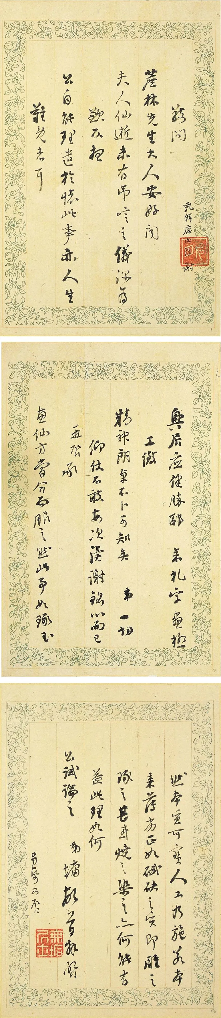 所谓“药洲图”,在一定程度上可以说是翁方纲的宦迹图。乾隆三十七年(1772)正月二十九日,翁方纲抵京,与钱大昕、钱载(1708~1793)等文人开始诗画酬答、金石雅集,忙得不亦乐乎。当时,翁方纲开始邀请文友题咏《药洲图》,故钱大昕所言“《药洲》卷留敝斋多时,尚未题就”即指此事。乾隆三十八年(1773)三月,翁方纲充补《四库全书》纂修官,九月授翰林院编修。乾隆三十九年(1774)七月十一日,时任翰林院侍讲学士、詹事府少詹事的钱大昕充河南乡试正考官,翁方纲赋诗《送辛楣典试河南》赠行。九月一日,钱大昕授广东学政,并于十月二十七日抵达广州。一前一后,翁方纲、钱大昕先后赴任药洲学署,倒是有趣。也在同年稍后的秋冬间,钱大昕的侄子钱坫(1744~1806)南下,翁方纲赋诗赠行并注“适以粤东学使廨《药洲图》属献之篆首也,时令叔辛楣视学在彼,献之将往省之”:男儿得名早,此际保谦难。入洛无肩比,冲霄好羽翰。今谁定文字,仆独好讥弹。人海三年梦,江头试忆看。临别留题卷,纵横大篆能。方当寻铉锴,且莫傲斯冰。惠氏前师在,珠江故事征。说经吾八载,力未一毫胜。从札中“《邑志》则在南中,未携至”判断,钱大昕尚在京师,故此札应书于乾隆三十七年二月至乾隆三十九年七月之间,为钱、翁两人日常的文事酬应。乾隆四十年六月后,钱大昕返里丁父母忧,从此不再复出。他主要是为《药洲图》卷的题跋之事书写一二,而提及朱彝尊《竹垞集》和某邑志等信息,乃为翁方纲借书之简单回复,都是翰林院文士之间的雅事。大概因为另有约请题咏,翁方纲索还《药洲图》时,钱大昕却仍在构思之中,深表歉意。结合翁方纲邀钱坫篆首之举,钱大昕撰写此书札或许也在乾隆三十九年出都前的早些时候。但文献显示,钱大昕事后可能没有再为《药洲图》卷题跋。劳树棠(1739~1816),原名瑾,字宝琳,号镜浦,山东阳信人。乾隆四十九年(1784)进士,授兵部车驾司主事,转职方司员外郎、武选司郎中,历官江南监察御史、江南河库道、直隶通永河道、江南苏松粮道等,为官廉洁,颇有政声。前承辱贶小缄,致谢,想登记室矣。渴想晤谈,想我友同此耿耿也。月之廿六等日,倘得于因公途次,并借枝栖中,半晌款话,中心企之。专此先订,诸惟鉴照,(不尽)容再缕述。临颖驰溯,草草不罄。清代名人中以“镜浦”为字号者,大致有二,一为劳树棠,二为毛辉祖(1709~1774)。毛辉祖,字镜浦,又字乃行,号敬园,山东历城人。乾隆十年(1745)进士,选翰林院庶吉士,历福建道、广东道监察御史,湖南学政,转礼科给事中,升太常寺少卿等。观察,在明清时期是对“道台”的尊称。道主要负有监察性质,有分守道和分巡道之分,还有一些不属布政、按察二司管辖的道,如海关道、管河道、督粮道、盐法道等。结合毛氏仕官履历,所谓“镜浦观察”肯定不是毛辉祖。至于劳树棠,《江苏省通志稿职官志》卷一七记载,嘉庆三年(1798)九月十三日授江南河库道,次年九月病免;嘉庆九年(1804)十月十八日调苏松督粮道,嘉庆十四年(1809)八月休致。两任江苏期间,他于嘉庆五年(1800)复官直隶通永道,管理河道事务。可以确定,翁方纲书致劳树棠称呼“观察”,应在嘉庆三年(1798)九月之后。《翁方纲年谱》记载,嘉庆六年(1801)二月二十七日,京察引见,已届古稀的翁方纲因年老奉旨以原品并往裕陵守护,三月十二日自京起程,三日后抵达遵化马兰峪。可以判断,“倘得于因公途次”应该便是“裕陵守护”。三年后的二月十七日,翁方纲则奉命以原品休致回籍。因此,翁方纲致信劳树棠即在嘉庆六年二月八日,或许京察尚未确定,只是相告大概。因途经通州,他预约借宿、晤谈之事,实为友朋之间的寒暄之语。黄易(1744~1802),字大易,号小松、秋盦、秋影庵主等,浙江仁和(今杭州)人。承家学,年少即喜金石之学,善诗文,工书画,尤精篆刻,名重一时。初为监生,随幕多年,乾隆五十四年(1789)十月,署兖州运河道同知,寻实授防河卫曹,后转济宁运河道同知。公务之余,遍访群碑,著有《小蓬莱阁金石文字》《小蓬莱阁金石目》《小蓬莱阁诗钞》等。蒋因培(1768~1839),字伯生,号辛峰,江苏常熟人。乾隆四十九年(1784)以国子监生应顺天乡试,始知名。入赀为县丞,嘉庆二年(1797)权费县巡检,补阳谷县丞,累署汶上、金乡、峄、滕、高密、巨野知县,嘉庆二十三年(1818)任齐河知县,嘉庆二十五年(1820)因忤上被劾,遣戍军台,未逾年释回,间游豫楚闽粤,晚岁掇拾剩稿,辑为《乌目山房诗存》。不晤数旬,渴怀已甚。昨承华翰,惠以名画,不特真且笔墨妙绝,割爱见贻,感佩何极,谢谢!至吾兄南行之期一定,定必过济,当写书信奉托,藉可快叙以慰渴想。弟抱孙实切欣幸,远承雅爱,何以克当,谨谢谢。楚氛未了,得豫中来信知,新野山中逃避千人,以致中州戒严,河帅即在汴城弹压,渊如似未能即返也。此候近祉,并谢不备。乾隆六十年(1795)闰二月五日,黄易母亲梁瑛卒于济宁,享年八十九岁。已任山东济宁运河道同知的黄易丁忧辞官,夏间携眷扶柩南返。嘉庆元年(1796)二月,他再次北上,嘉庆二年(1797)五月服阕,被临时借用捕河,至嘉庆四年(1799)十一月再仕运河同知。自任运河道以来的十年,黄易访碑、交游、艺术创作臻于鼎盛。薛龙春根据《何琪致黄易札》考证,黄易有孙一,曰黄珍,生于嘉庆元年三月。所谓“弟抱孙实切欣幸,远承雅爱,何以克当,谨谢谢”,即是指黄易喜添男孙,回应蒋因培的祝