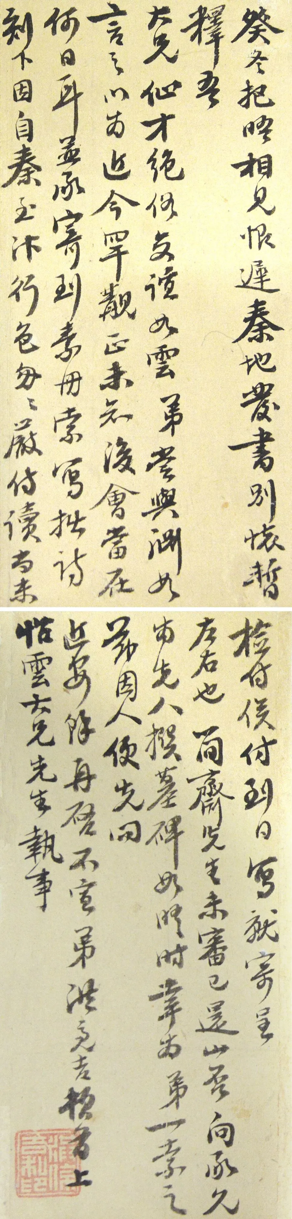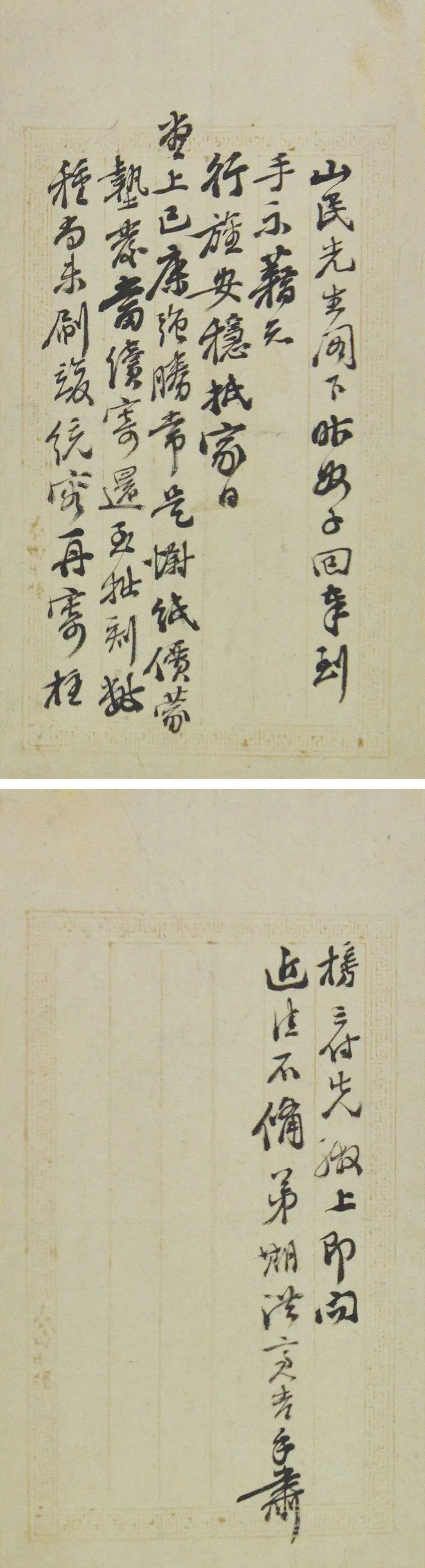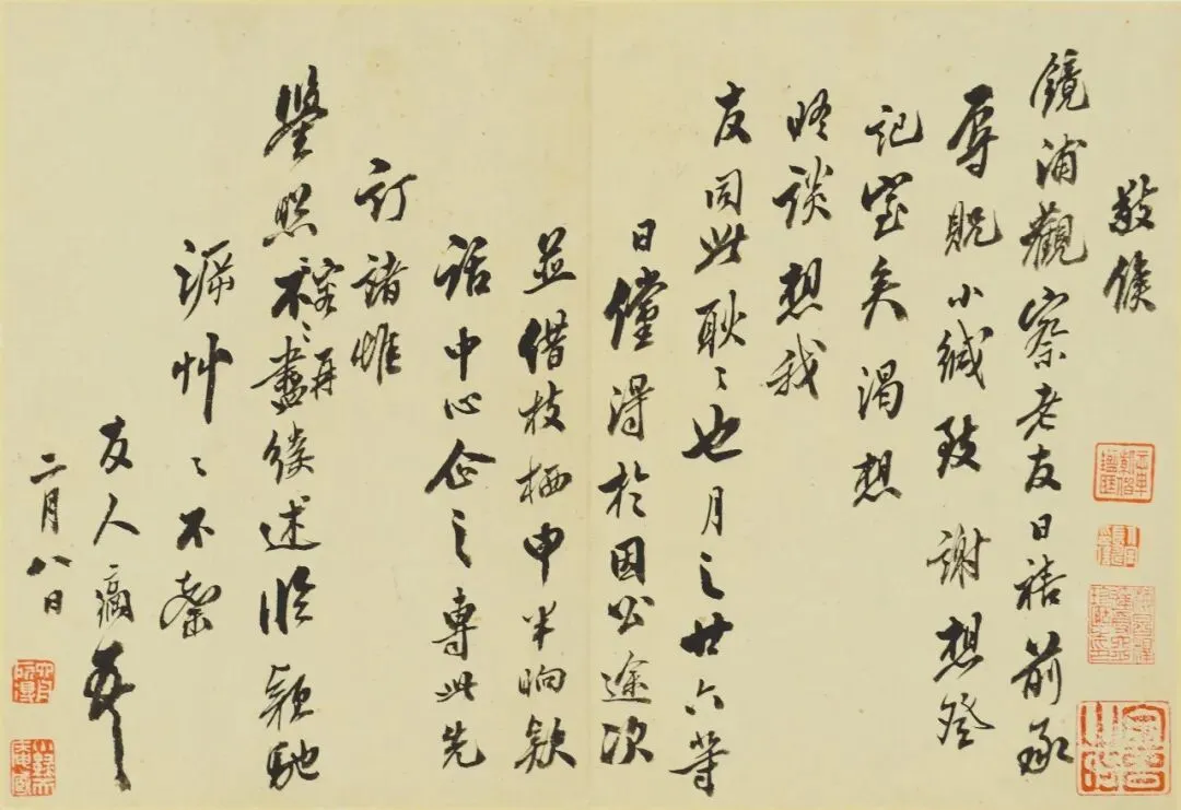 所谓“药洲图”,在一定程度上可以说是翁方纲的宦迹图。乾隆三十七年(1772)正月二十九日,翁方纲抵京,与钱大昕、钱载(1708~1793)等文人开始诗画酬答、金石雅集,忙得不亦乐乎。当时,翁方纲开始邀请文友题咏《药洲图》,故钱大昕所言“《药洲》卷留敝斋多时,尚未题就”即指此事。乾隆三十八年(1773)三月,翁方纲充补《四库全书》纂修官,九月授翰林院编修。乾隆三十九年(1774)七月十一日,时任翰林院侍讲学士、詹事府少詹事的钱大昕充河南乡试正考官,翁方纲赋诗《送辛楣典试河南》赠行。九月一日,钱大昕授广东学政,并于十月二十七日抵达广州。一前一后,翁方纲、钱大昕先后赴任药洲学署,倒是有趣。也在同年稍后的秋冬间,钱大昕的侄子钱坫(1744~1806)南下,翁方纲赋诗赠行并注“适以粤东学使廨《药洲图》属献之篆首也,时令叔辛楣视学在彼,献之将往省之”:男儿得名早,此际保谦难。入洛无肩比,冲霄好羽翰。今谁定文字,仆独好讥弹。人海三年梦,江头试忆看。临别留题卷,纵横大篆能。方当寻铉锴,且莫傲斯冰。惠氏前师在,珠江故事征。说经吾八载,力未一毫胜。从札中“《邑志》则在南中,未携至”判断,钱大昕尚在京师,故此札应书于乾隆三十七年二月至乾隆三十九年七月之间,为钱、翁两人日常的文事酬应。乾隆四十年六月后,钱大昕返里丁父母忧,从此不再复出。他主要是为《药洲图》卷的题跋之事书写一二,而提及朱彝尊《竹垞集》和某邑志等信息,乃为翁方纲借书之简单回复,都是翰林院文士之间的雅事。大概因为另有约请题咏,翁方纲索还《药洲图》时,钱大昕却仍在构思之中,深表歉意。结合翁方纲邀钱坫篆首之举,钱大昕撰写此书札或许也在乾隆三十九年出都前的早些时候。但文献显示,钱大昕事后可能没有再为《药洲图》卷题跋。劳树棠(1739~1816),原名瑾,字宝琳,号镜浦,山东阳信人。乾隆四十九年(1784)进士,授兵部车驾司主事,转职方司员外郎、武选司郎中,历官江南监察御史、江南河库道、直隶通永河道、江南苏松粮道等,为官廉洁,颇有政声。前承辱贶小缄,致谢,想登记室矣。渴想晤谈,想我友同此耿耿也。月之廿六等日,倘得于因公途次,并借枝栖中,半晌款话,中心企之。专此先订,诸惟鉴照,(不尽)容再缕述。临颖驰溯,草草不罄。清代名人中以“镜浦”为字号者,大致有二,一为劳树棠,二为毛辉祖(1709~1774)。毛辉祖,字镜浦,又字乃行,号敬园,山东历城人。乾隆十年(1745)进士,选翰林院庶吉士,历福建道、广东道监察御史,湖南学政,转礼科给事中,升太常寺少卿等。观察,在明清时期是对“道台”的尊称。道主要负有监察性质,有分守道和分巡道之分,还有一些不属布政、按察二司管辖的道,如海关道、管河道、督粮道、盐法道等。结合毛氏仕官履历,所谓“镜浦观察”肯定不是毛辉祖。至于劳树棠,《江苏省通志稿职官志》卷一七记载,嘉庆三年(1798)九月十三日授江南河库道,次年九月病免;嘉庆九年(1804)十月十八日调苏松督粮道,嘉庆十四年(1809)八月休致。两任江苏期间,他于嘉庆五年(1800)复官直隶通永道,管理河道事务。可以确定,翁方纲书致劳树棠称呼“观察”,应在嘉庆三年(1798)九月之后。《翁方纲年谱》记载,嘉庆六年(1801)二月二十七日,京察引见,已届古稀的翁方纲因年老奉旨以原品并往裕陵守护,三月十二日自京起程,三日后抵达遵化马兰峪。可以判断,“倘得于因公途次”应该便是“裕陵守护”。三年后的二月十七日,翁方纲则奉命以原品休致回籍。因此,翁方纲致信劳树棠即在嘉庆六年二月八日,或许京察尚未确定,只是相告大概。因途经通州,他预约借宿、晤谈之事,实为友朋之间的寒暄之语。黄易(1744~1802),字大易,号小松、秋盦、秋影庵主等,浙江仁和(今杭州)人。承家学,年少即喜金石之学,善诗文,工书画,尤精篆刻,名重一时。初为监生,随幕多年,乾隆五十四年(1789)十月,署兖州运河道同知,寻实授防河卫曹,后转济宁运河道同知。公务之余,遍访群碑,著有《小蓬莱阁金石文字》《小蓬莱阁金石目》《小蓬莱阁诗钞》等。蒋因培(1768~1839),字伯生,号辛峰,江苏常熟人。乾隆四十九年(1784)以国子监生应顺天乡试,始知名。入赀为县丞,嘉庆二年(1797)权费县巡检,补阳谷县丞,累署汶上、金乡、峄、滕、高密、巨野知县,嘉庆二十三年(1818)任齐河知县,嘉庆二十五年(1820)因忤上被劾,遣戍军台,未逾年释回,间游豫楚闽粤,晚岁掇拾剩稿,辑为《乌目山房诗存》。不晤数旬,渴怀已甚。昨承华翰,惠以名画,不特真且笔墨妙绝,割爱见贻,感佩何极,谢谢!至吾兄南行之期一定,定必过济,当写书信奉托,藉可快叙以慰渴想。弟抱孙实切欣幸,远承雅爱,何以克当,谨谢谢。楚氛未了,得豫中来信知,新野山中逃避千人,以致中州戒严,河帅即在汴城弹压,渊如似未能即返也。此候近祉,并谢不备。乾隆六十年(1795)闰二月五日,黄易母亲梁瑛卒于济宁,享年八十九岁。已任山东济宁运河道同知的黄易丁忧辞官,夏间携眷扶柩南返。嘉庆元年(1796)二月,他再次北上,嘉庆二年(1797)五月服阕,被临时借用捕河,至嘉庆四年(1799)十一月再仕运河同知。自任运河道以来的十年,黄易访碑、交游、艺术创作臻于鼎盛。薛龙春根据《何琪致黄易札》考证,黄易有孙一,曰黄珍,生于嘉庆元年三月。所谓“弟抱孙实切欣幸,远承雅爱,何以克当,谨谢谢”,即是指黄易喜添男孙,回应蒋因培的祝