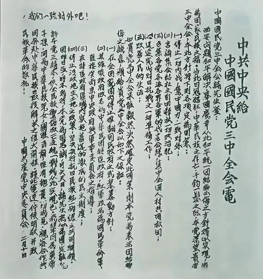 就在会议召开的前五天,一封来自延安的电报,像一颗石子投进了平静的湖水。2月10日,中共中央致电国民党五届三中全会,提出“停止内战,一致对外”等五项要求,并作出“停止武力推翻国民党政府”“红军改编为国民革命军”等四项保证。这份电报,是中共在民族危亡之际的真诚让步,也是对国民党的一次“求和信号”。