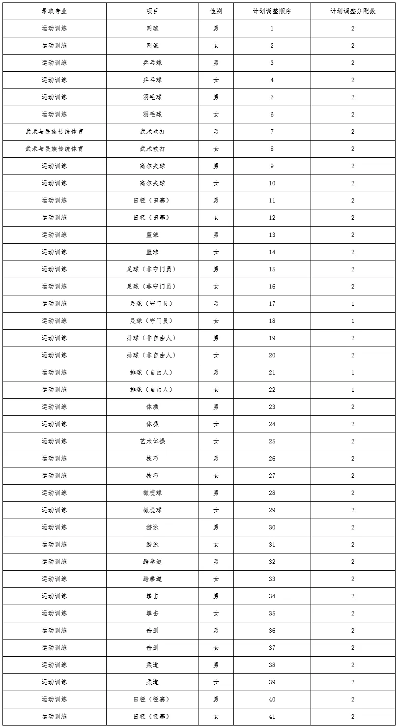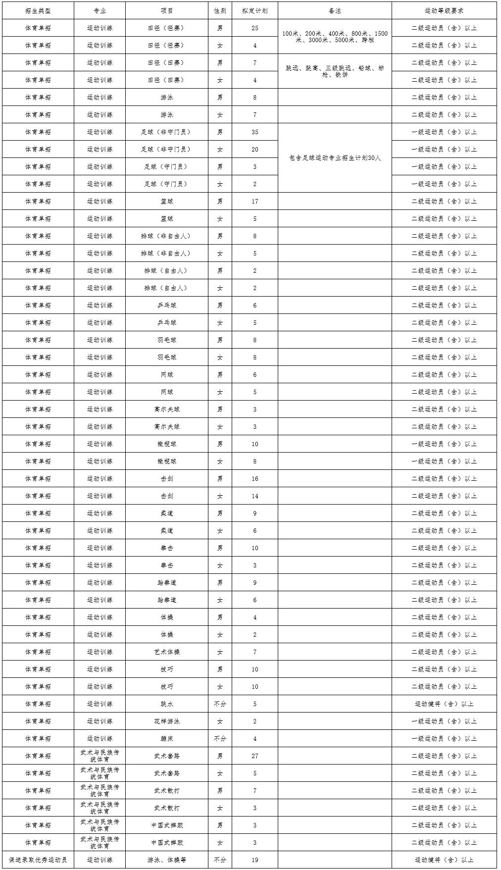 1.运动训练、武术与民族传统体育和足球运动专业合计拟招收400人,其中包含保送录取优秀运动员招生计划,最终计划数以上级部门正式下达为准。面向全国招生,不列分省计划。