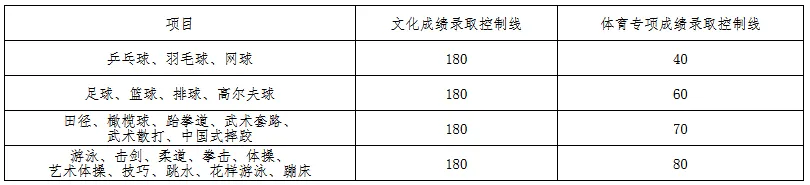 3.在文化成绩和体育专项成绩均达到我校最低录取控制分数线的基础上,根据考生的文化成绩(折合百分制后)和体育专项成绩 3:7 的比例进行综合评价,计算考生录取综合分。具体公式:综合分=(文化成绩/6)×30%+体育专项成绩×70%。综合分计算时保留小数点后两位,采用四舍五入计数保留法。