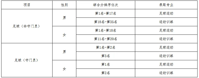 4.跳水、蹦床项目不分男女录取,其他项目均按性别分别进行录取。田径项目按田赛、径赛两类分别录取;排球项目按非自由人、自由人分别录取;足球项目按非守门员、守门员分别录取。足球项目考生在进行专业分配时,按照综合分排序,优先录取至足球运动专业,录满后再录取至运动训练专业,具体如下: