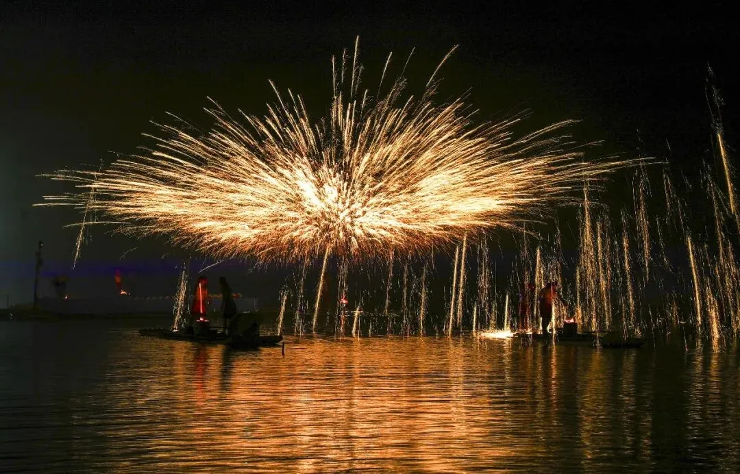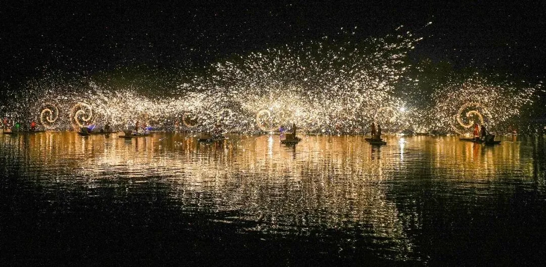 此次带来表演的打铁花团队共50人,来自重庆铜梁。团队负责人陈潼介绍,水上实景打铁花视觉效果极佳,但表演者既要保持竹筏平衡,又要精准把控铁水温度与击打节奏,难度颇高。连日来,他们辗转各地演出,只为让更多人感受传统民俗文化的独特魅力。