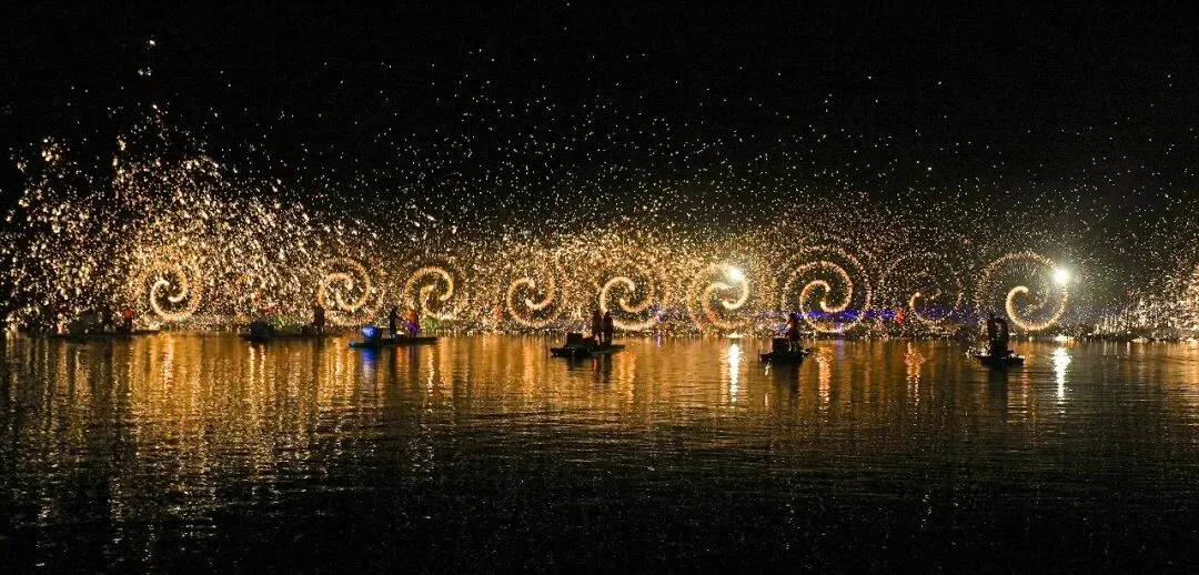 铁花飞溅,24炉铁花化作漫天金雨坠入湖面,配合12组风火轮绚丽开转,天上金雨与水中倒影交相辉映,带来双倍的视觉震撼,景区内千盏灯火、湖面龙马花灯在火光映照下熠熠生辉,共同构成“天为幕、湖为镜、火为画”的沉浸式诗意奇观。