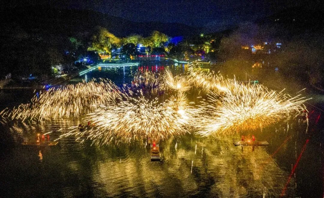 2月14日,南京珍珠泉风景区启幕花火璀璨过大年活动,作为“我在北岸过大年”系列活动之一,将持续至3月8日,上演南京今年规模最大的山水实景打铁花。夜幕降临,镜山湖上,24叶竹筏静静飘荡。表演者们赤膊上阵,迎着寒风,守在温度高达1600摄氏度的铁炉旁,将生铁熔化成滚烫的铁水。伴着震天鼓点与绚烂火花,表演者一人拿着盛有铁水的花棒,另一人拿着一根柳木棒,奋力挥臂将铁水击打而出,刹那间,金红的铁水在夜空中炸裂开来,漫天的铁花点亮夜空,如流星坠落、如金菊怒放、如银河倾泻,在夜幕下勾勒出“火树银花映山河”的震撼奇观。