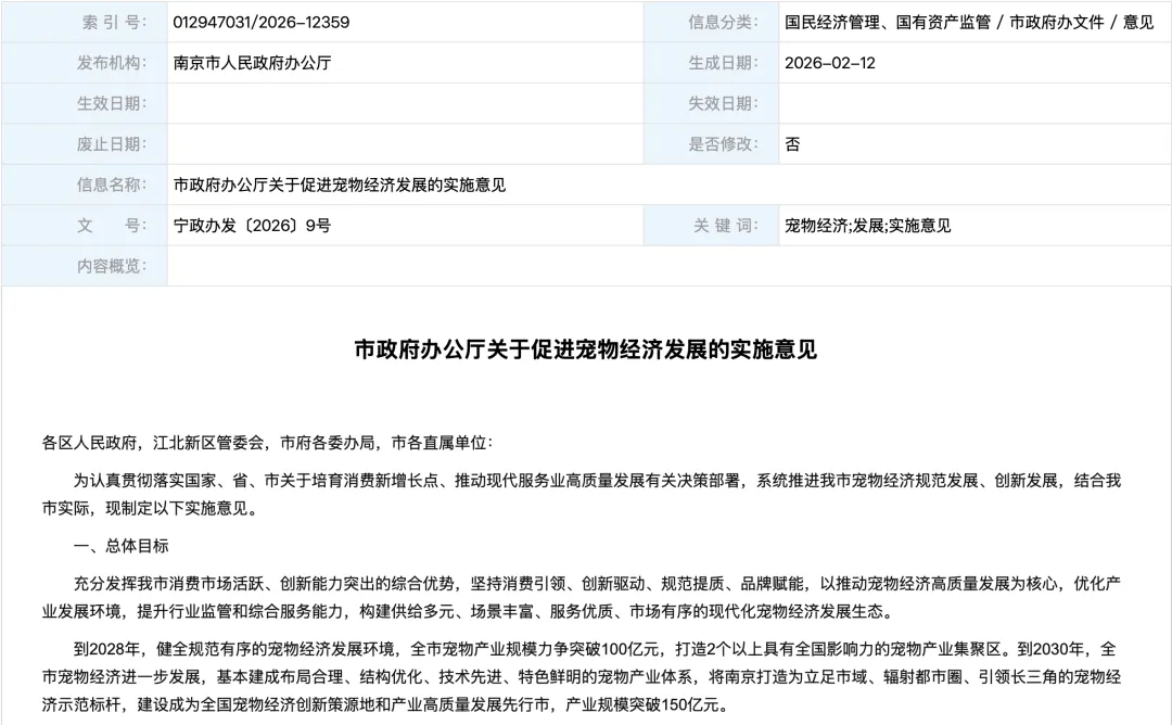 加快发展“宠物+服务”。加强宠物寄养、洗护、训练、诊疗等涉宠服务行业规范化建设,督促服务主体制定完善服务标准,公开服务项目和收费标准,强化合同履行,推进诚信经营。鼓励宠物诊疗机构开展连锁化、专科化经营,配备先进诊疗设备,支持在线问诊、健康管理、智慧诊疗等新模式应用;鼓励南京农业大学建设集医疗、教学、科研服务于一体的综合性动物医疗中心,培育高水平宠物诊疗标杆。鼓励保险机构开发多样化宠物保险产品,支持栖霞区等在辖区内宠物医院推广宠物保险项目,探索宠物医疗保险与健康管理结合新模式,宠物(犬猫)医疗保险覆盖率提升至30%以上,降低宠物诊疗风险纠纷。