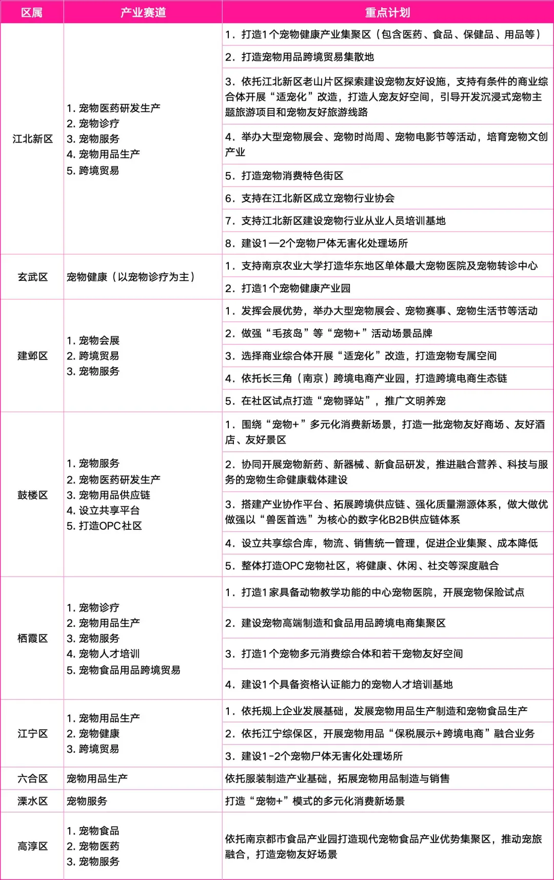打造特色宠物产业集群。引导和支持有条件的区,打造特色鲜明、布局优化、链条完善、协作紧密、创新驱动的宠物产业集群。大力支持宠物产业企业发展,在融资、场地、人才方面对成长型企业给予支持。重点在江北新区打造宠物健康产业集聚区和宠物医药研发生产集聚区,在玄武区打造宠物健康产业集聚区,在溧水区打造宠物产业科技集聚区,在高淳区打造宠物食品和用品生产集聚区,在栖霞区打造宠物消费集聚区,在江北新区、建邺区、江宁区、栖霞区分别打造有影响力的宠物用品跨境贸易集聚区。鼓励涉农单位等探索布局宠物经济赛道,进一步做优做大做强宠物经济品牌、IP、场景等。