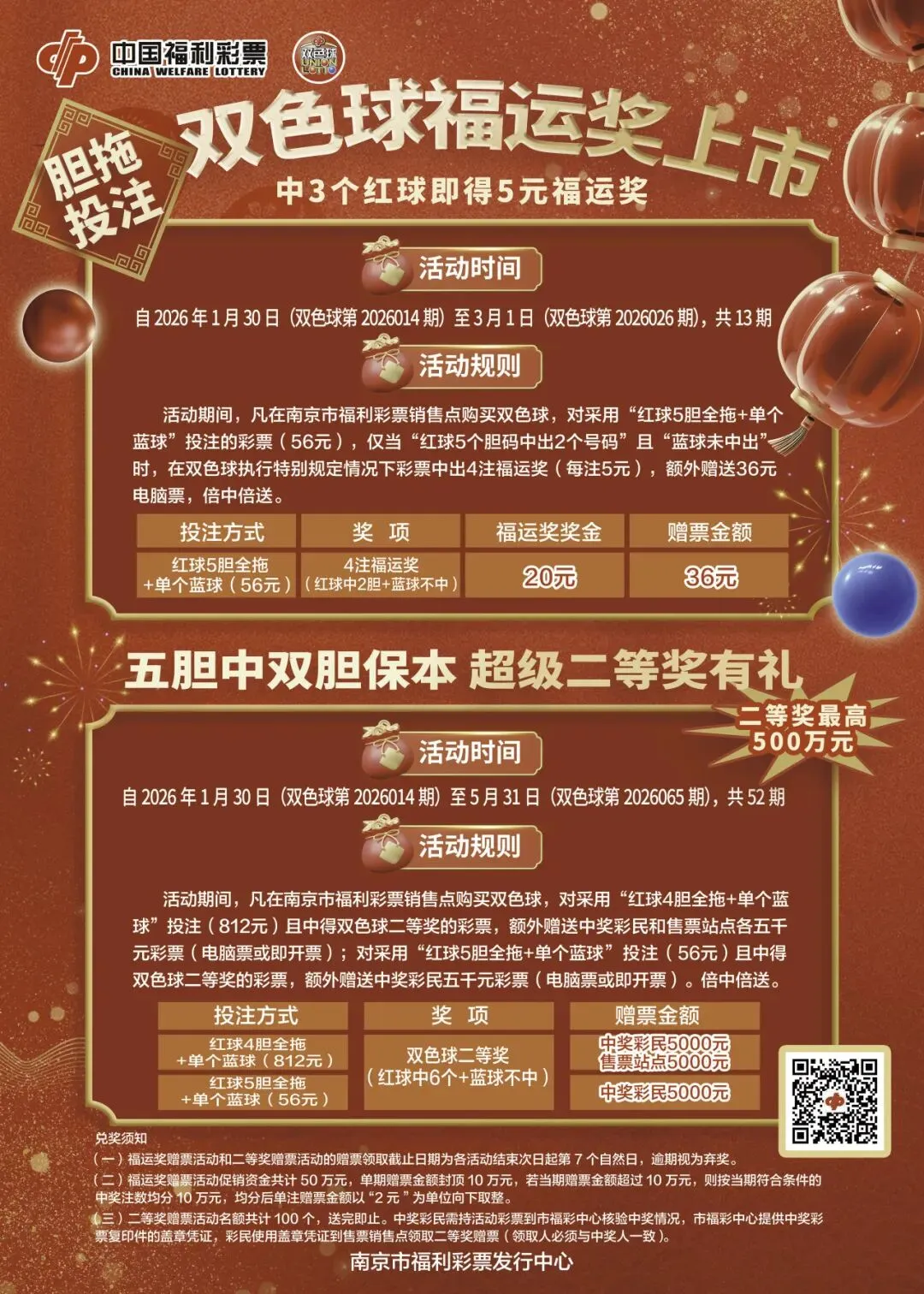 活动期间,凡在南京市福利彩票销售点购买双色球,对采用“红球5胆全拖+单个蓝球”投注的彩票(56元),仅当“红球5个胆码中出2个号码”且“蓝球未中出”时,在双色球执行特别规定情况下彩票中出4注福运奖(每注5元),额外赠送36元电脑票,倍中倍送。