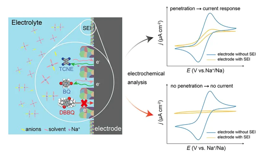 我们开发了一种使用不同大小的氧化还原媒介体分子的探针方法,只有特定尺寸的探针分子可以穿过SEI的孔道结构、抵达电极表面并产生电流(图1),以此来判断所形成SEI的孔隙情况。