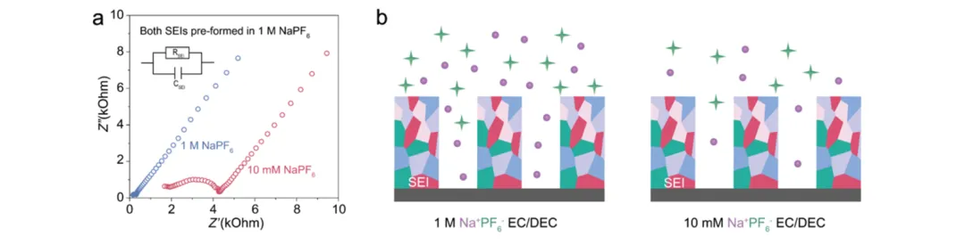 图2:电解液中盐浓度对SEI层的影响(a) Nyquist图; (b) 电解液对SEI层扩散通道中 Na⁺的影响示意图