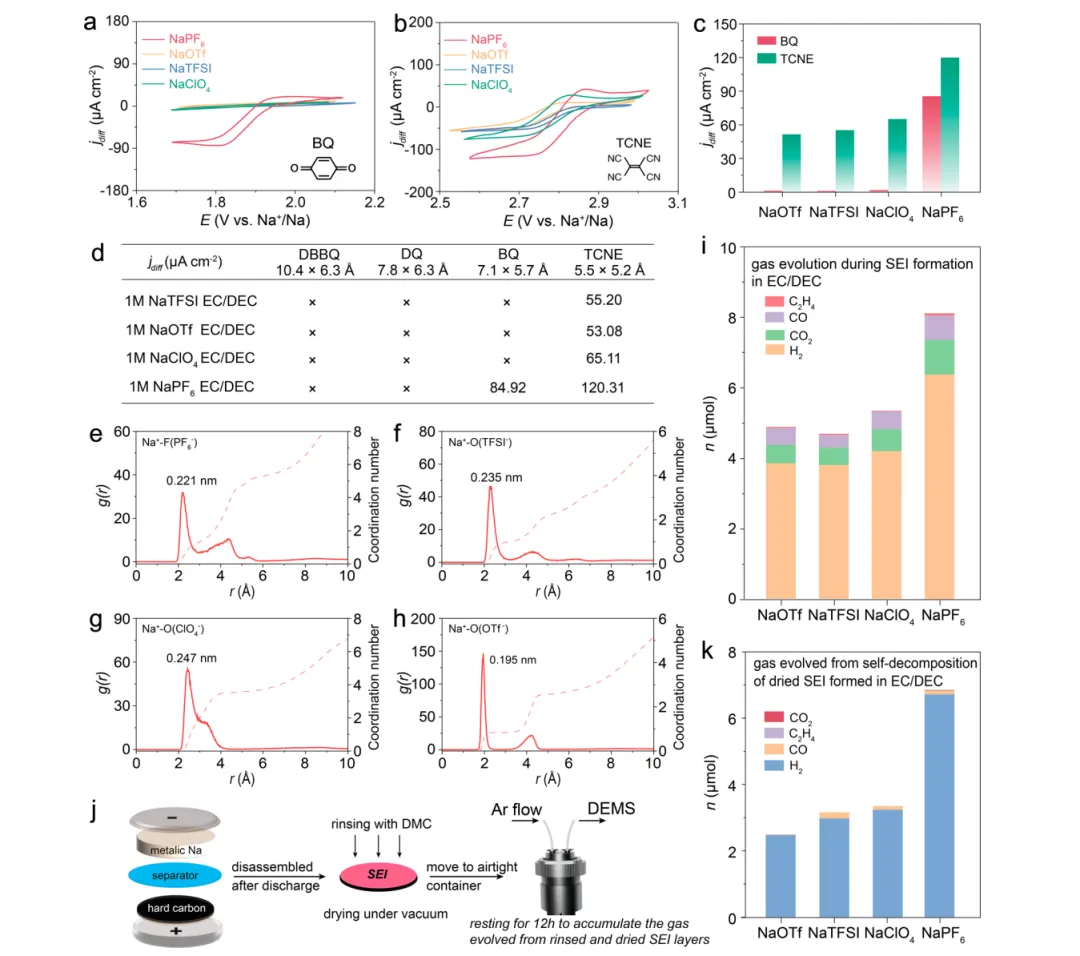 图3. 在碳酸酯电解液中所形成SEI层的扩散通道特性: (a) BQ 的CV曲线; (b) TCNE 的CV曲线; (c) 扩散限制电流密度的比较; (d) 在1 M不同钠盐电解液中,氧化还原介体对SEI层的穿透情况; (e-h) 分子动力学模拟; (i) SEI层形成过程中的析气; (j) DEMS测定流程图; (k) SEI层自分解过程中的析气。