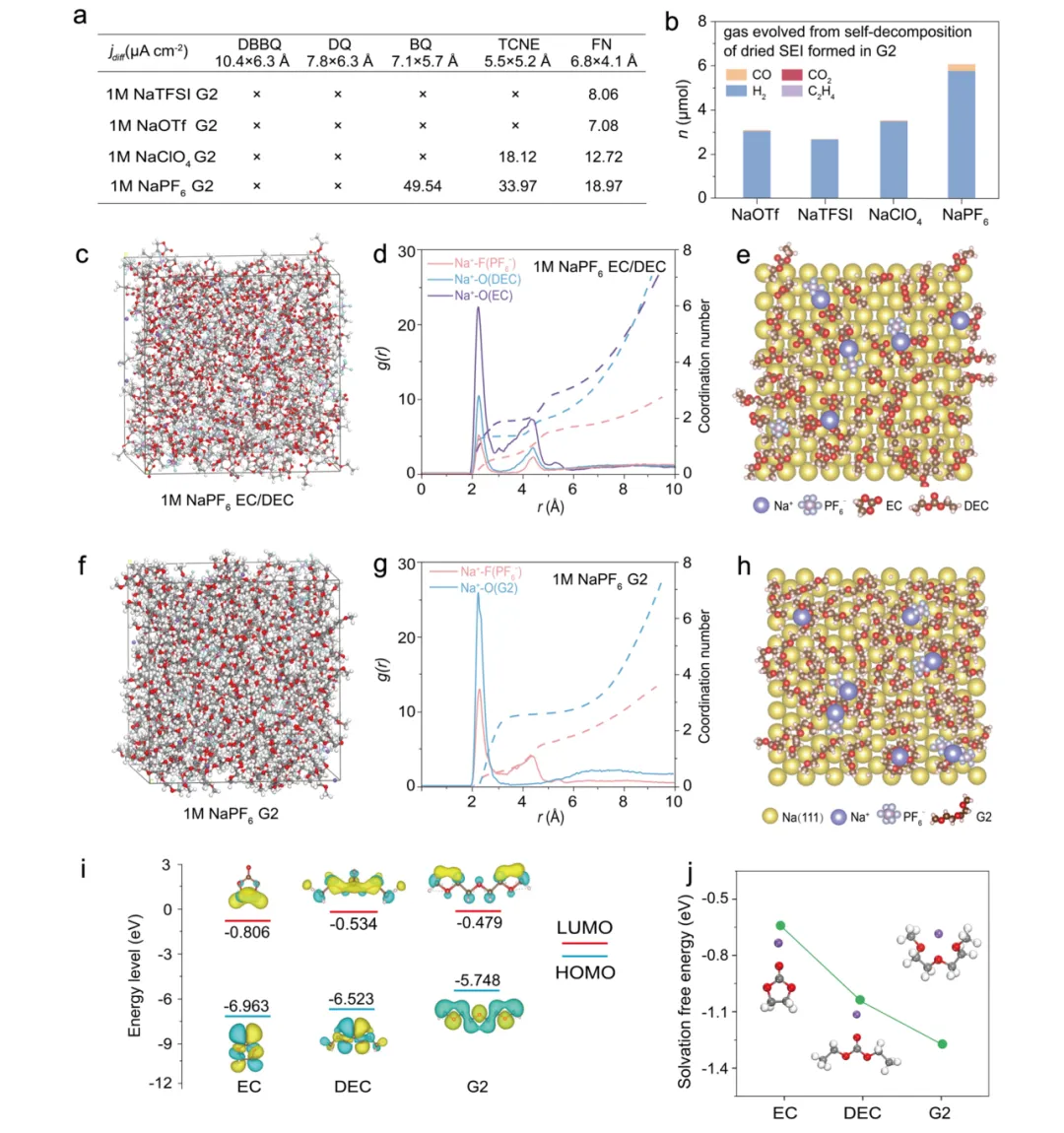 图4. 在醚类与碳酸酯电解液中形成的SEI层的比较: (a) 在1 M不同钠盐G2电解液中,氧化还原介体对SEI层的穿透情况; (b) SEI层自分解过程中的析气; (c-e) NaPF₆-EC/DEC 和 (f-h) 分子动力学模拟; (i) 分子轨道能量计算; (j) 溶剂化自由能计算