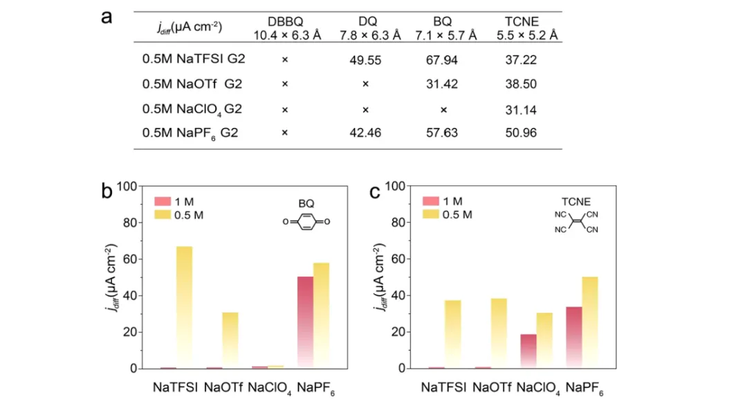 图5: (a) 在0.5 M不同钠盐的G2电解液中,氧化还原介体对SEI层的穿透情况; (b, c) 在不同盐浓度(0.5 M 和 1 M)下形成的SEI层, (b) BQ 和 (c) TCNE 的扩散限制电流密度的比较