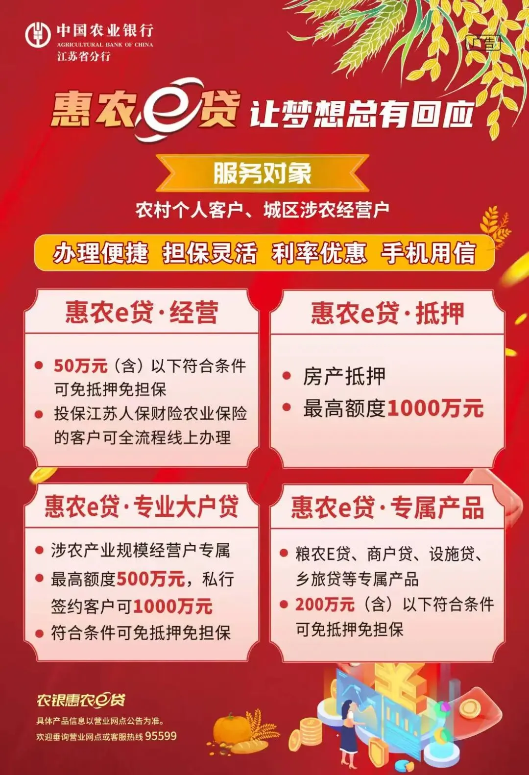 中国农业银行最新推出专项惠农贷款,为街道餐饮、水果、超市凡涉及农副产品行业涉农行业客户凡经营满三年,即可申请小额纯信用贷款,无需抵押;若您拥有房产抵押,更可享受优先办理与优惠利率。本次贷款产品利率优惠,整体维持在2.5%以内,助力您的经营稳健成长。