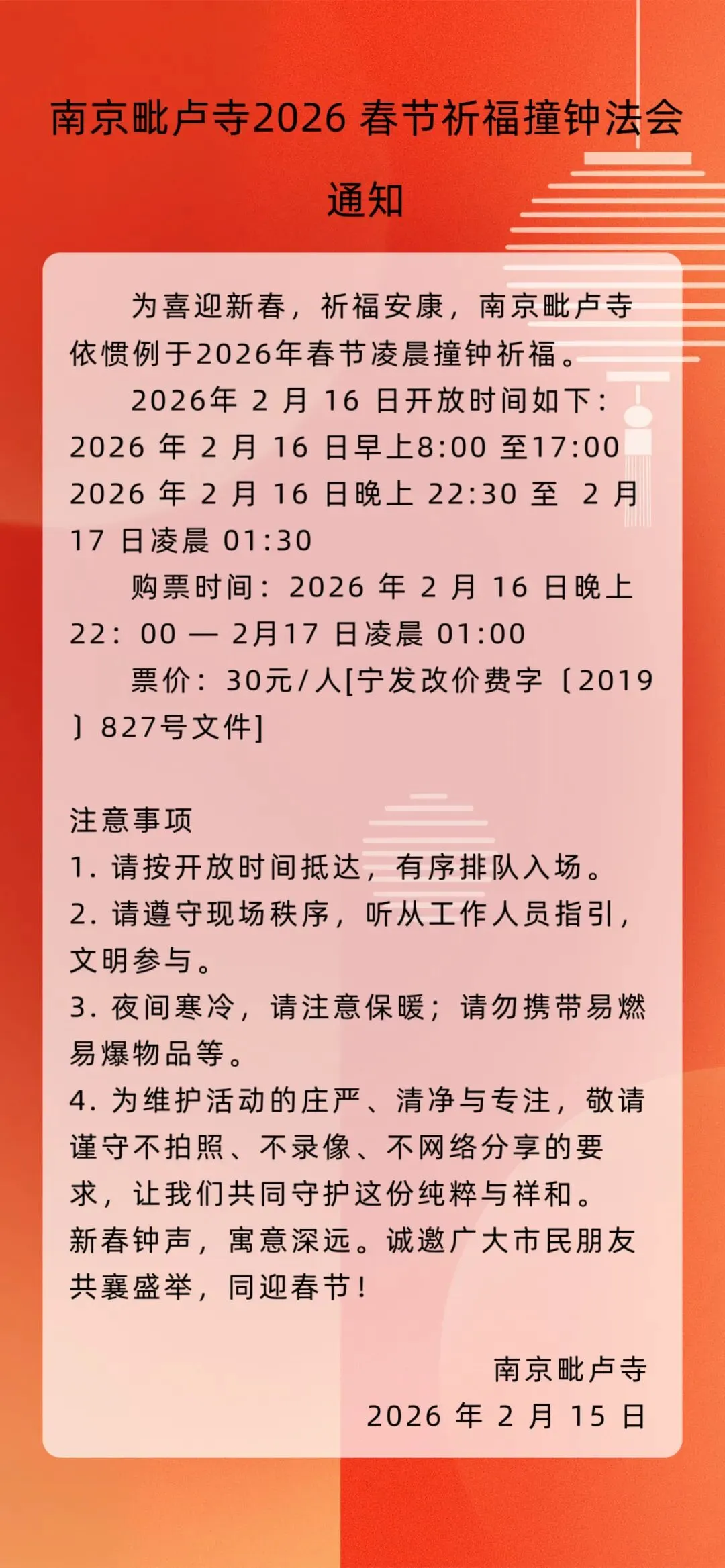 >南京毗卢寺2026 春节祈福撞钟法会通知