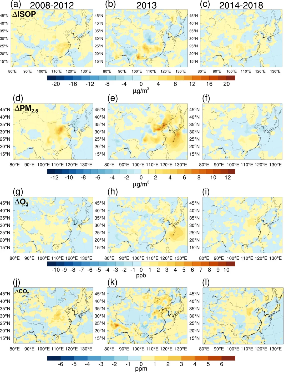 异戊二烯是BVOCs的主要组分。如图2所示,在相互作用影响下,2008–2012年东亚地区异戊二烯浓度整体呈上升趋势,增幅约为8–18 μg/m³。这一变化主要归因于较高的PM₂.₅浓度对植被BVOC排放的促进作用。随着O₃浓度逐年升高,其对植被的氧化损伤效应逐步增强,从而抑制BVOCs排放,导致异戊二烯浓度的增幅逐年减小。近地面PM₂.₅浓度变化趋势与异戊二烯基本一致,整体呈增加趋势,但增幅亦随时间减弱。异戊二烯浓度的显著上升有利于近地面O₃的生成,而PM₂.₅浓度增加通过削弱光化学反应速率对O₃生成产生抑制作用。在两者综合影响下,2008–2012年近地面O₃浓度总体增加约2–4 ppb。相比之下,2014–2018年中国东部地区近地面O₃浓度增加更为显著,增幅约为2–6 ppb。CO₂浓度变化趋势与O₃基本一致。2008–2012年CO₂浓度增加约3–5 ppm;而在2014–2018年,O₃增幅最大的华北地区CO₂浓度最高可增加约6 ppm。