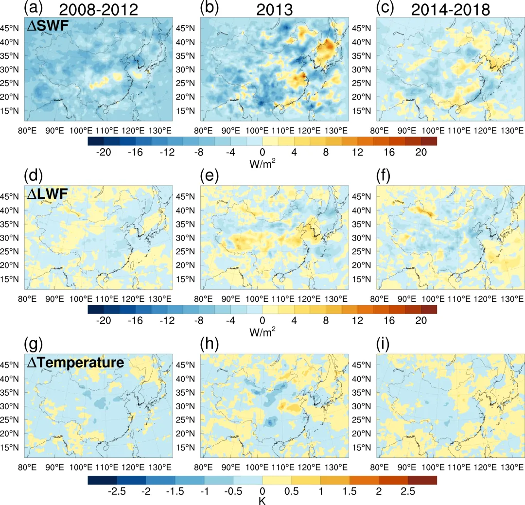 PM₂.₅、O₃和CO₂浓度变化通过调节大气辐射收支显著影响近地面温度。近地面向下短波辐射通量的空间分布与PM₂.₅浓度变化呈显著负相关关系。2008–2012年,受增加的PM₂.₅浓度影响,东亚地区近地面向下短波辐射通量减少约10–20 W/m²,长波辐射通量减少约2–8 W/m²,导致中国大部分地区近地面温度降低约0.5–1 K。2014–2018年,随着PM₂.₅浓度整体下降,短波辐射通量减弱趋势明显缓解,东亚大部分地区近地面向下短波辐射减少约4–12 W/m²;在华北和西南等PM₂.₅ 显著下降区域,短波辐射通量则相应增加约8 W/m²。同时,伴随短波辐射增强及O₃和CO₂浓度升高,长波辐射通量出现一定幅度的增加。2014–2018年中国中部和南部地区长波辐射通量增加约2–8 W/m²,进而使近地面温度普遍升高约0.5–1 K(图3)。
