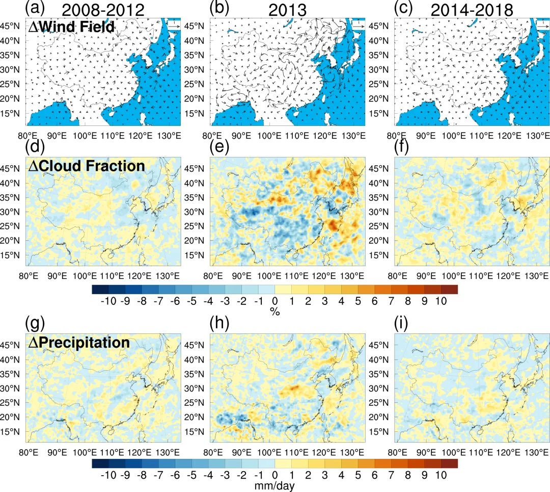 图4表明,2008–2012年中国大部分地区的显著降温削弱了海陆热力差异,导致偏北风和偏西风增强约0.2–0.5 m/s。同时,中国西南地区的局地增温(图3g)强化了低层偏南气流。增强的偏南风将水汽输送至更北区域,并与华北地区增强的偏北风在中高纬度地区辐合,进而促进云量增加约6–10%,降水增强约4–8 mm/d。相比之下,2014–2018年中国北部和南部地区出现明显升温,增强了海陆热力差异,进而强化东亚夏季风环流。受此影响,中国东部和东北地区低层偏东风和偏南风增强约0.5–1 m/s。增强的偏南与偏东气流输送更多水汽,导致云量增加约6–12%,降水增强约4–10 m/s。