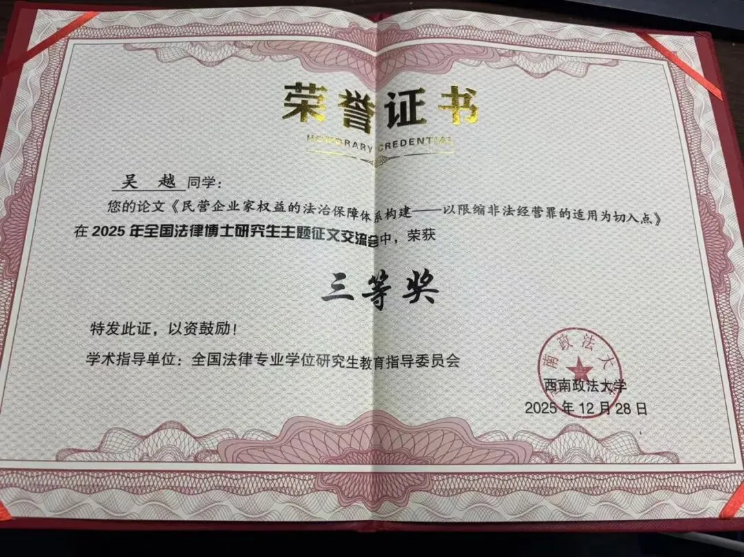 2025年,我参加了清华大学高级研究班的培训及中国政法大学卓越律师的评选,也参加了全国法律博士征文比赛获得了名次。通过不断的接触、学习、交流,视野一定会有所得拓宽,势必对自己的职业发展带来收获。