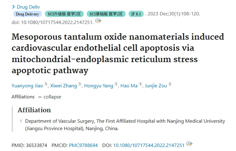 题目:Mesoporous tantalum oxide nanomaterials induced cardiovascular endothelial cell apoptosis via mitochondrial-endoplasmic reticulum stress apoptotic pathway