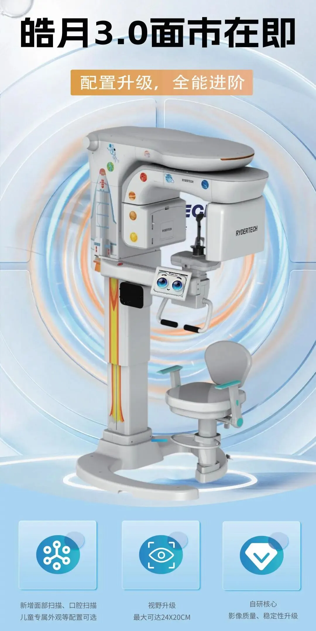 经过持续打磨,技术迭代。此次展会,其升级之作——皓月3.0口腔CT也将前瞻性亮相。新一代产品在核心性能、视野范围及功能配置上均有升级,预示着口腔影像将迎来新的突破。