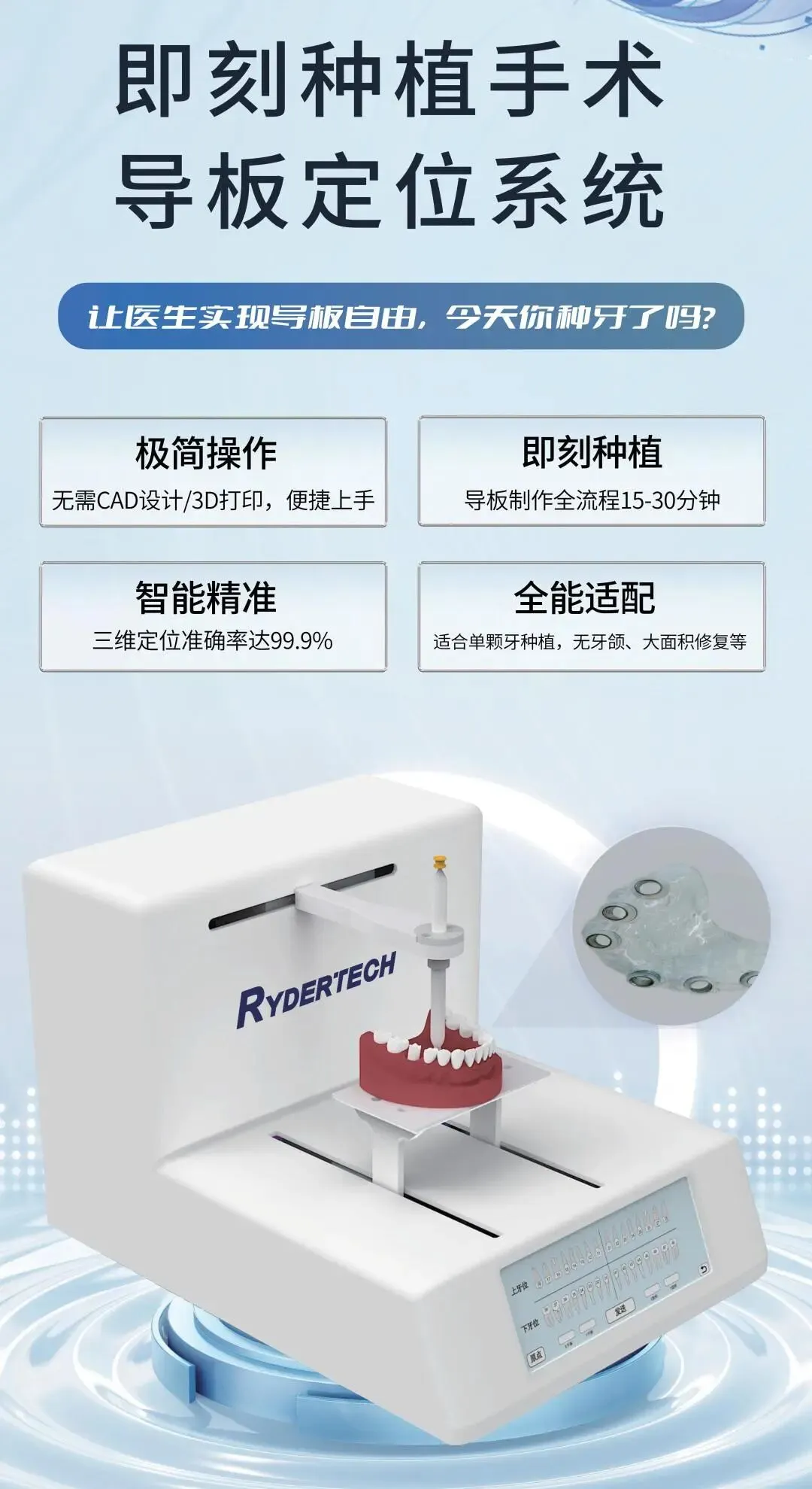 该系统无需CAD设计,不依赖3D打印机,30分钟左右即可完成种植导板制作,以低成本、高效率,助力医生实现“导板自由”。
