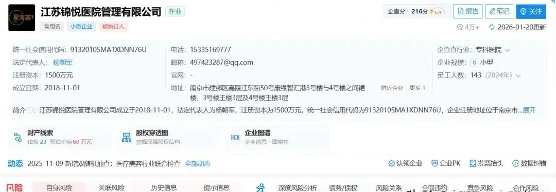 地址没换,公司还是江苏锦悦医院管理有限公司,注册资本1500万看着不少,但天眼查上近千条投诉、多次成被执行人、欠租被起诉、员工讨薪上过新闻。这不是突然垮的,是早就晃得厉害,最后靠“停业”喘口气。