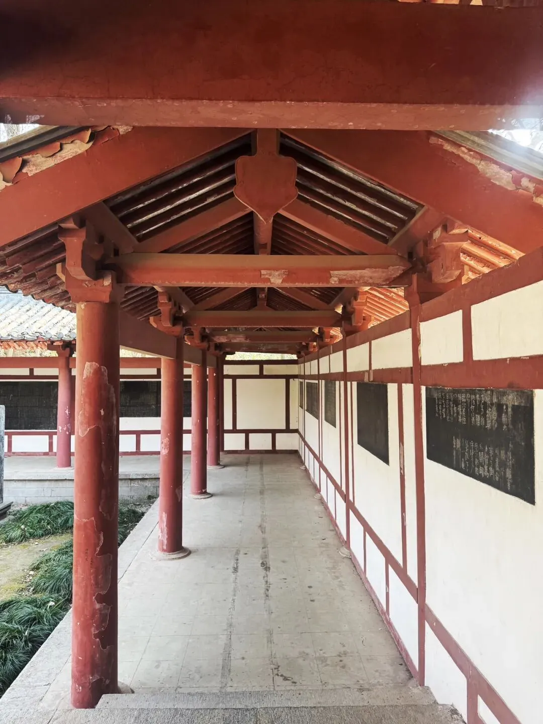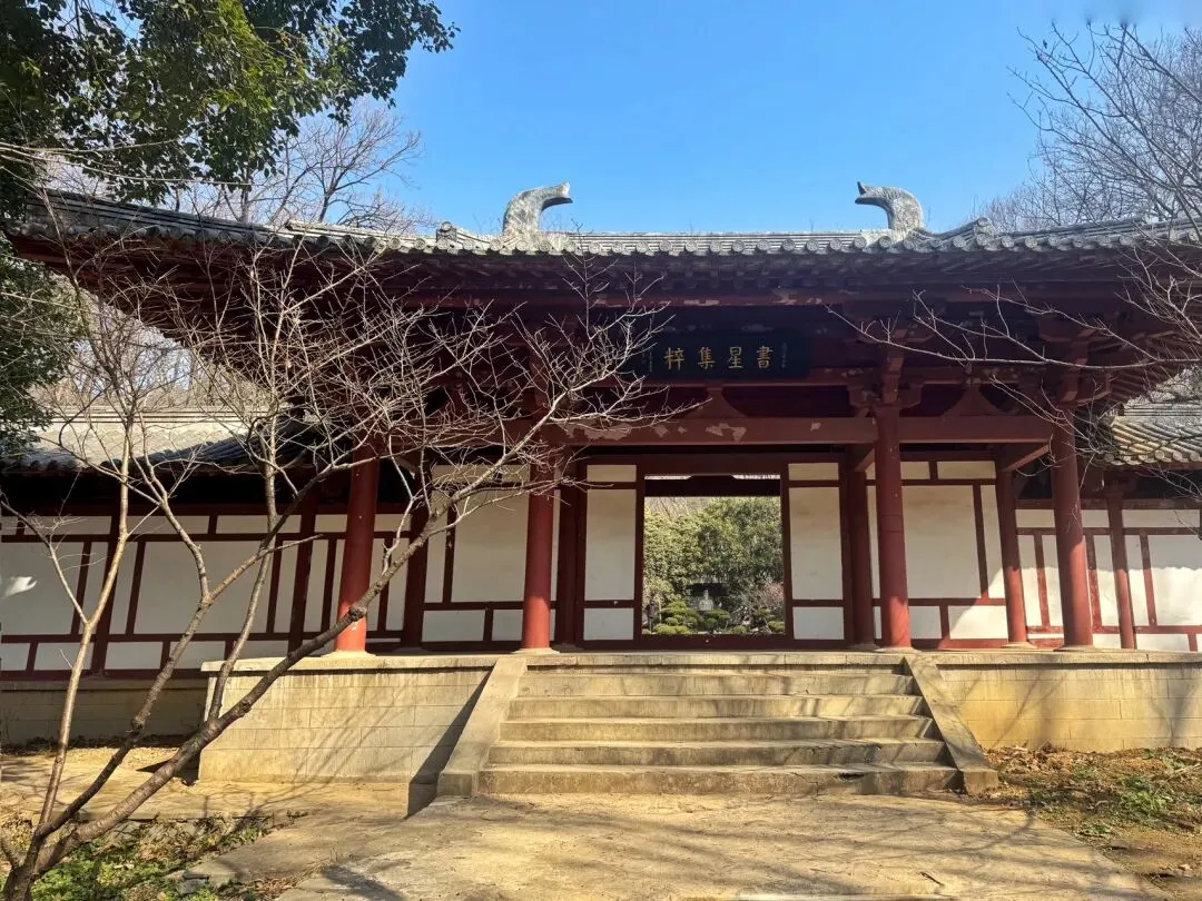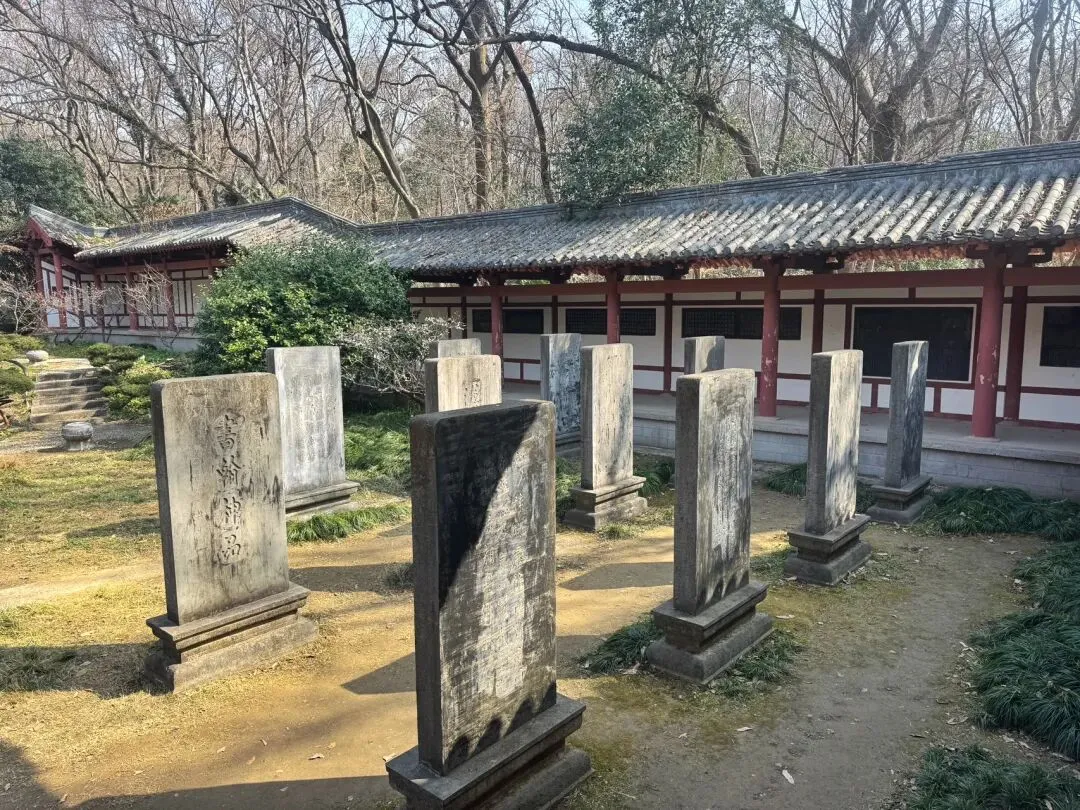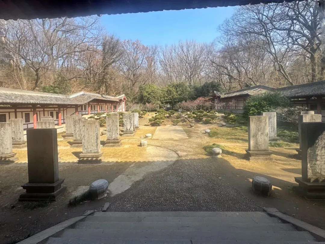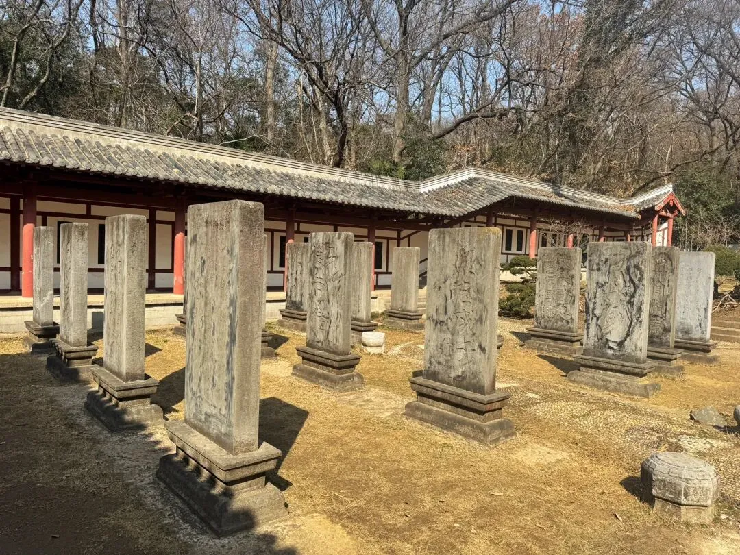 南京颜真卿碑林,位于紫金山下明孝陵景区,毗邻七号门。从七号门入口进入景区后,右转向北沿着林中小路徒步约1公里,看到一座仿唐风格的庭院,正门上方匾额“书星集粹”四个大字。