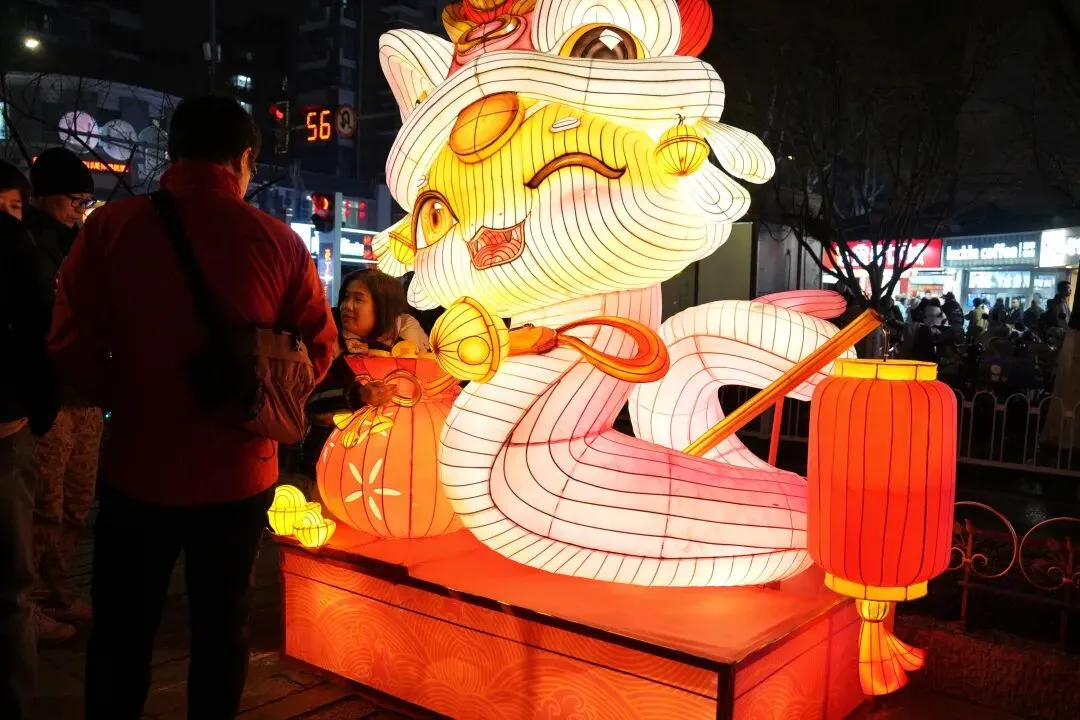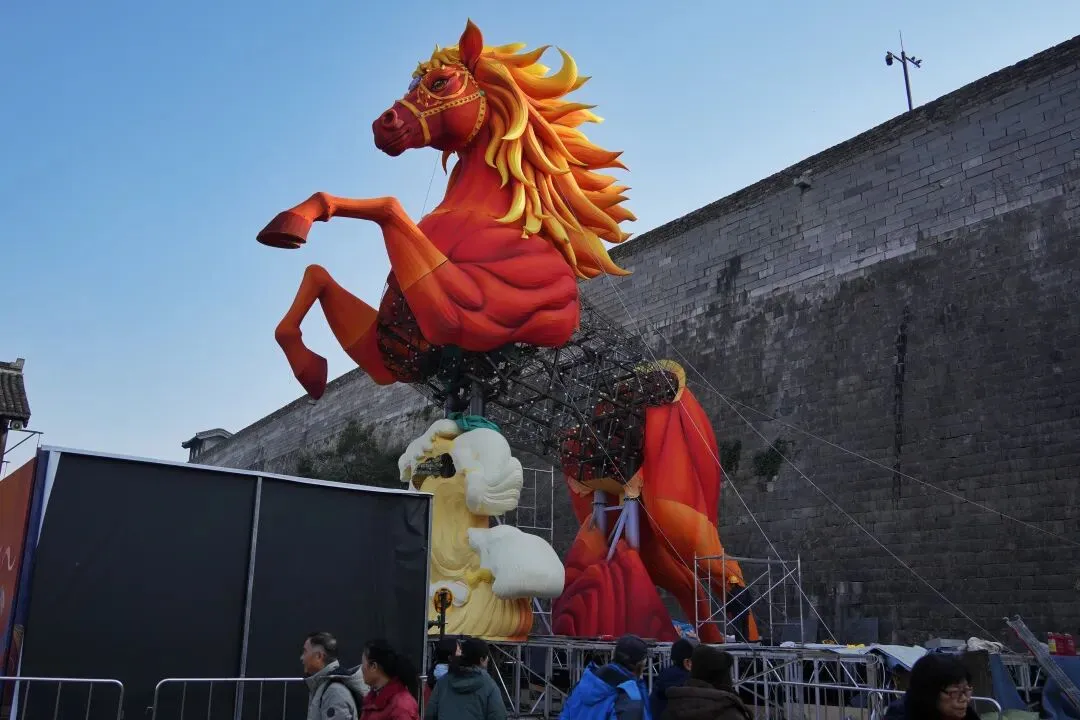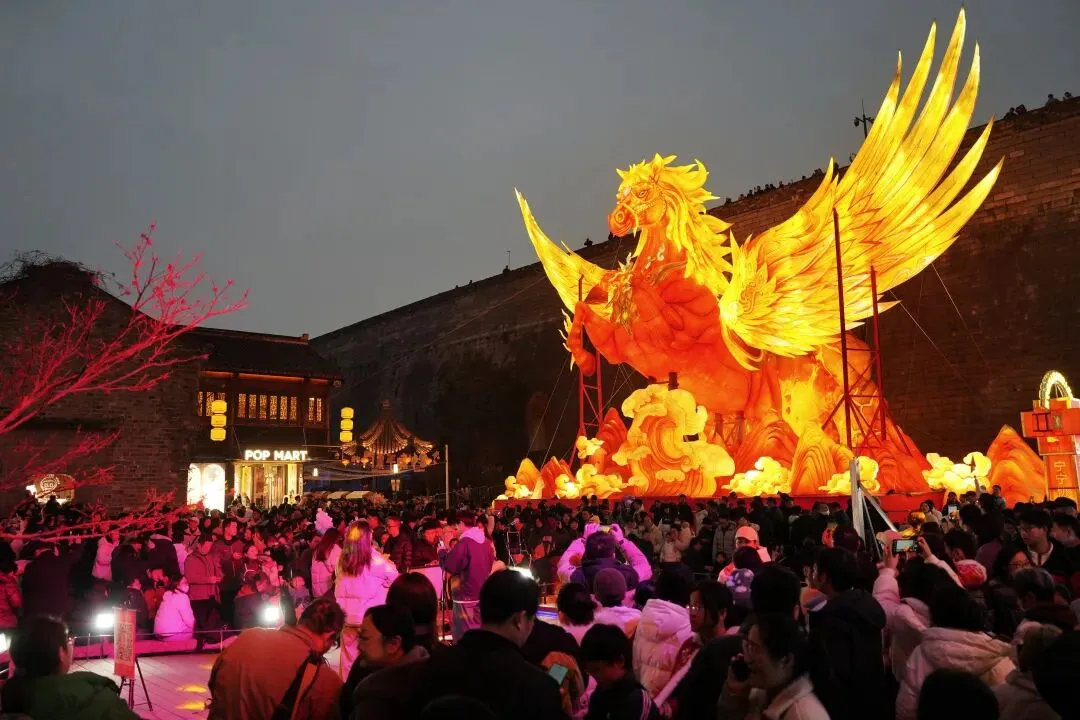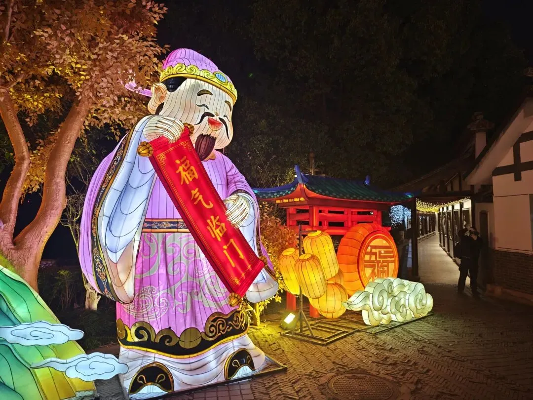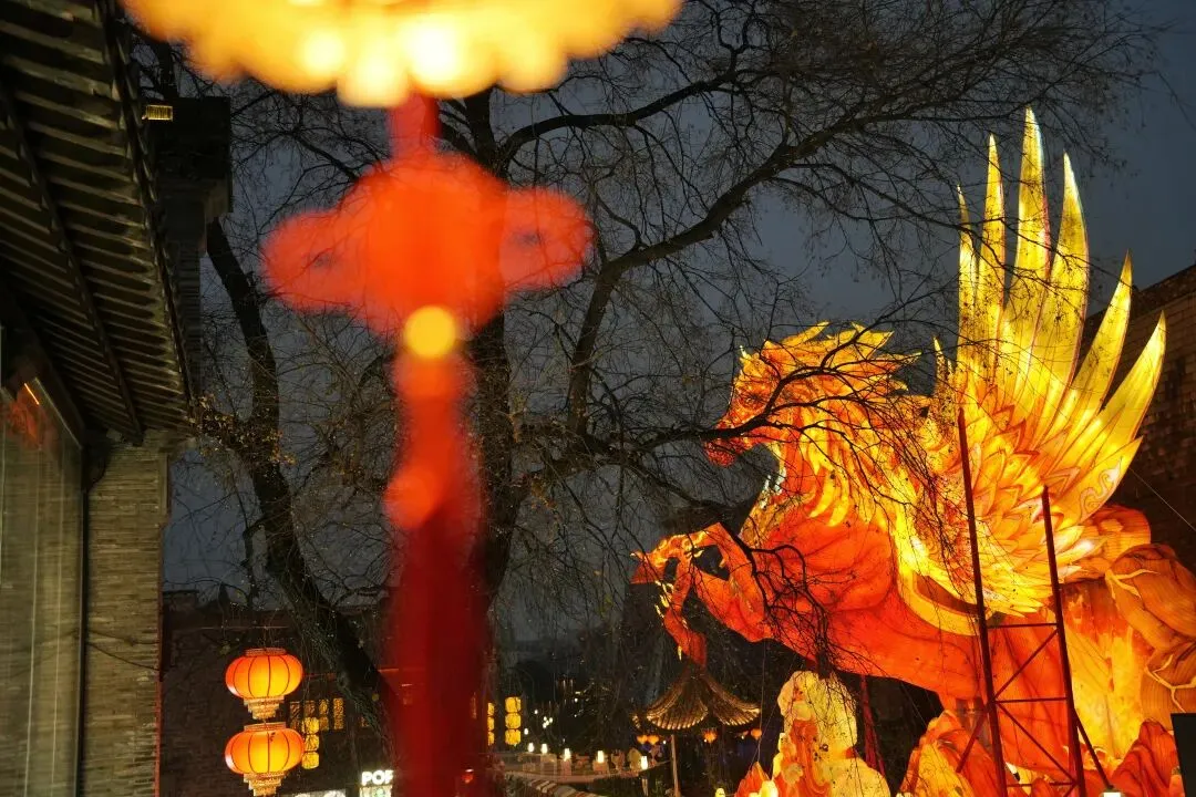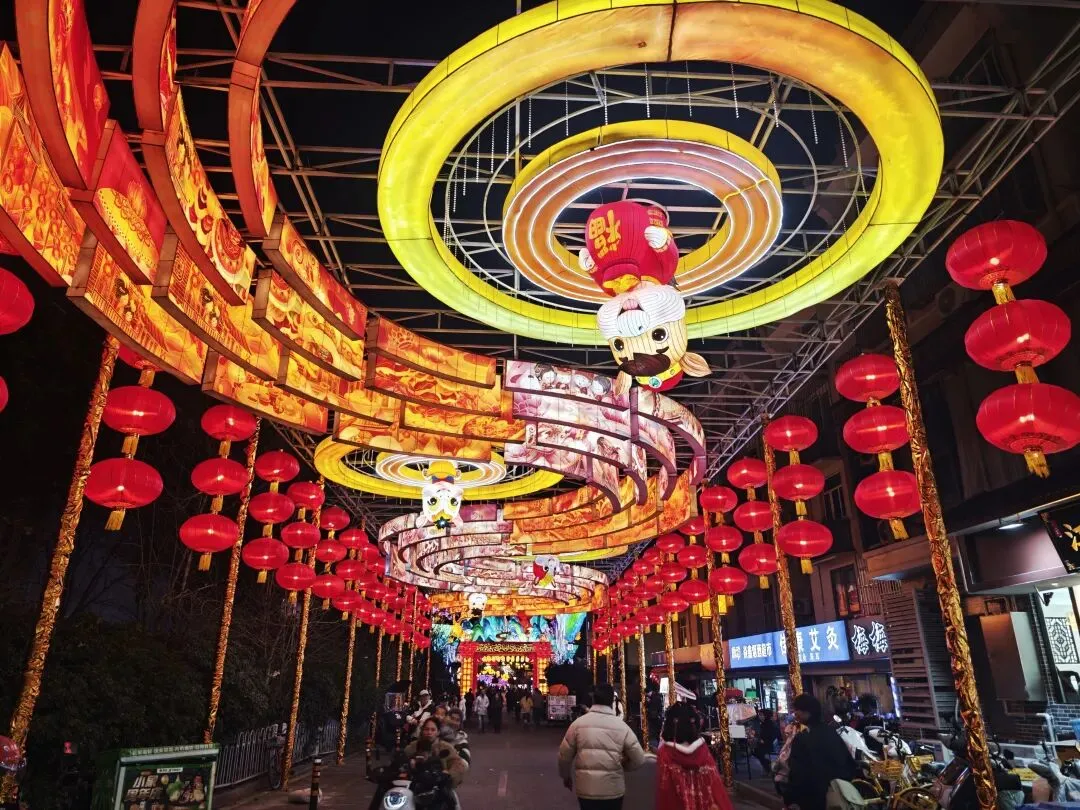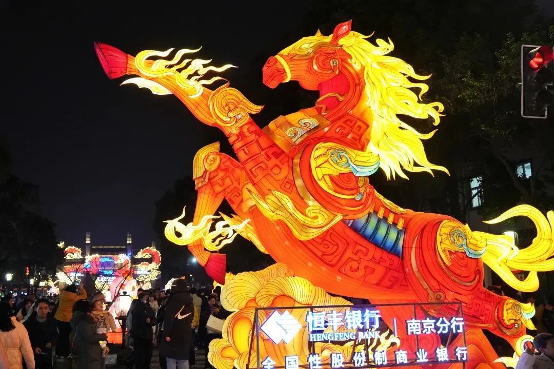 老门东的青石板巷被暮色轻轻笼罩,一排排彩灯顺着屋檐垂落,风一吹便轻轻摇晃,把古巷染得温柔又热闹。巨型主题灯组在夜色降临的瞬间次第亮起,金红交错的飞马灯、金鱼灯、凤凰灯、生肖灯……璀璨绽放流光溢彩,一瞬间便如点亮了整座金陵城。