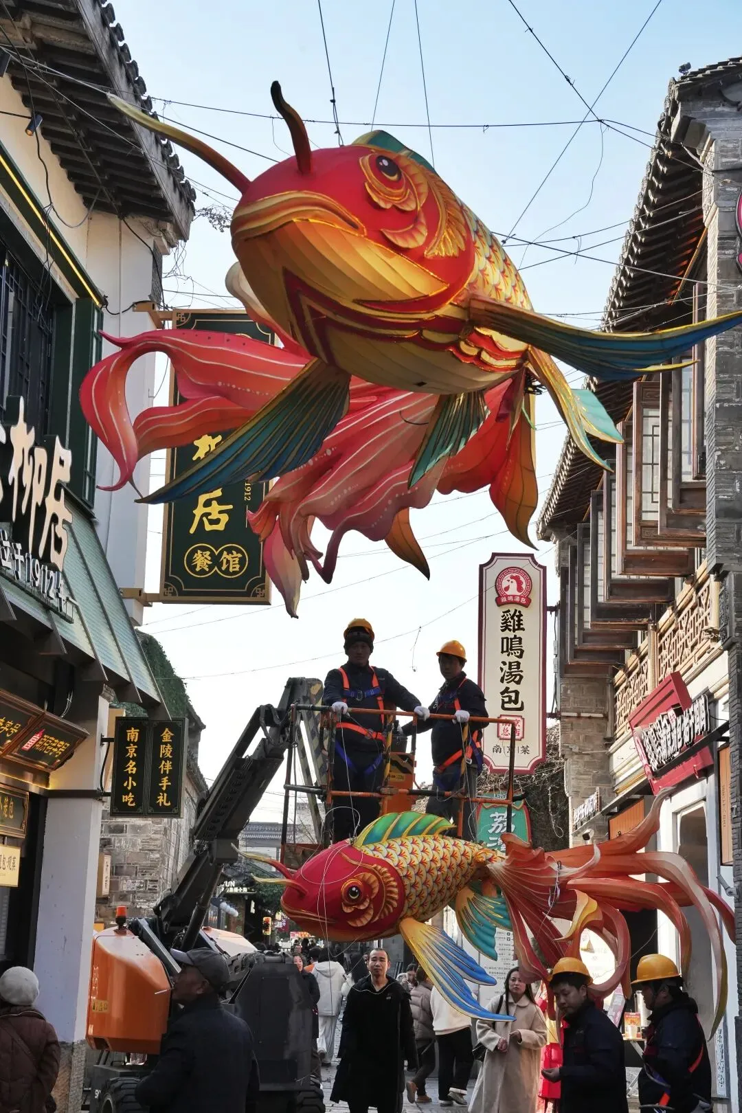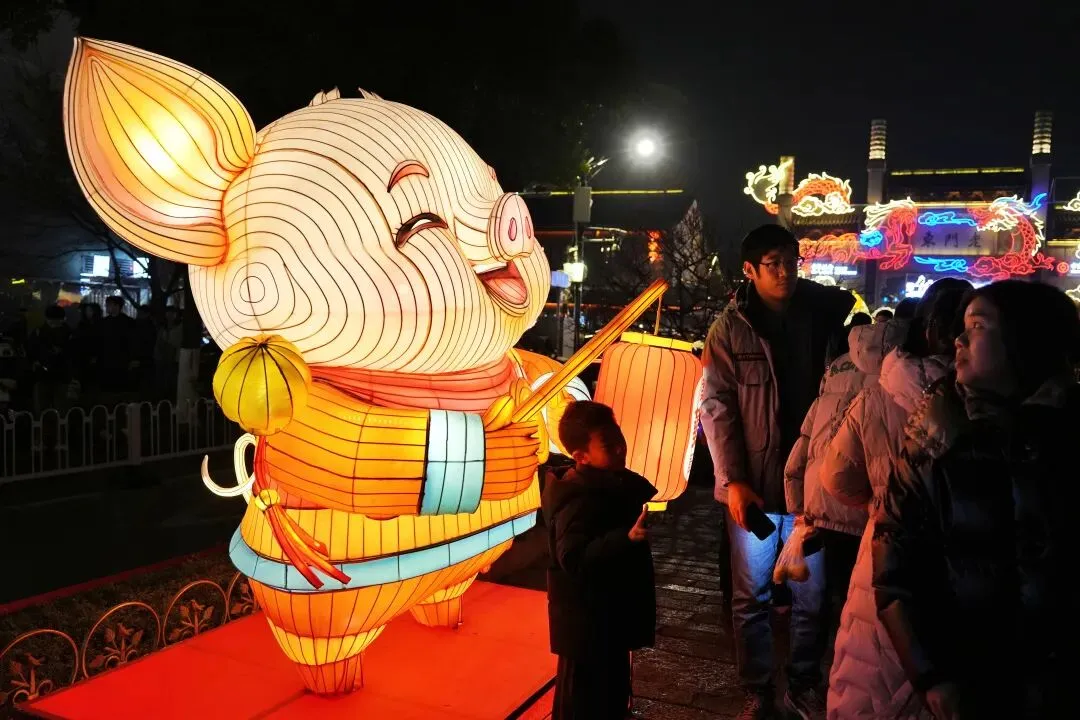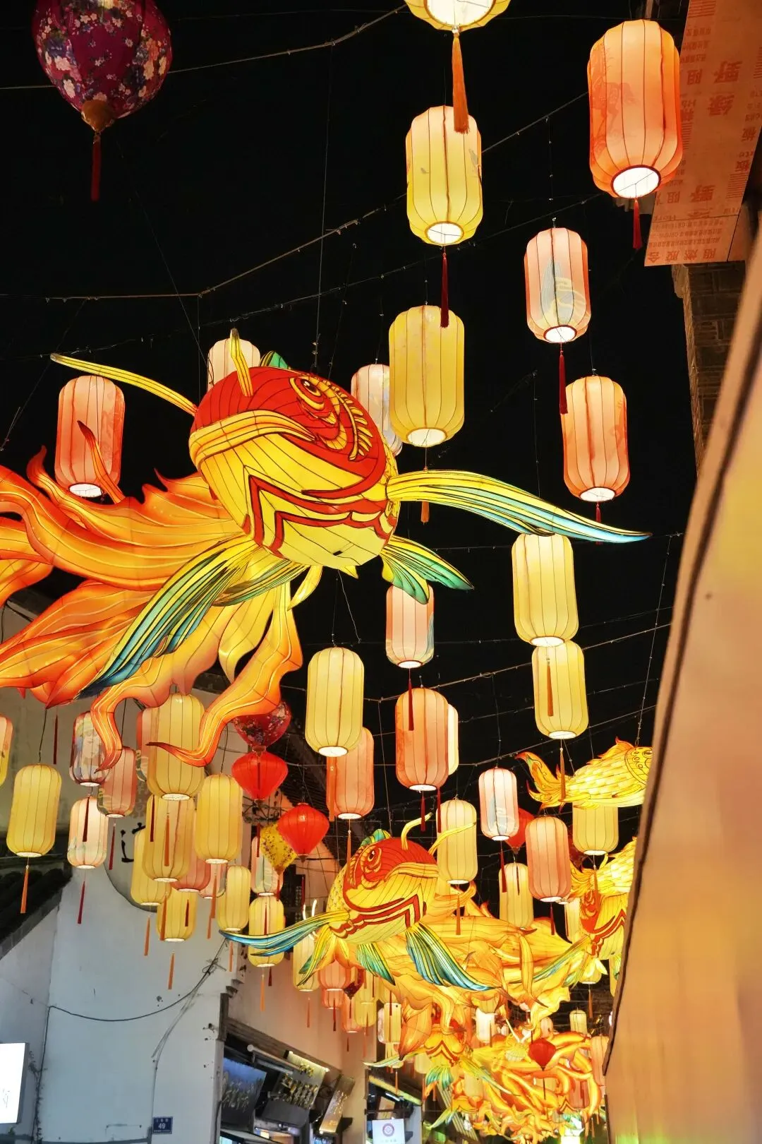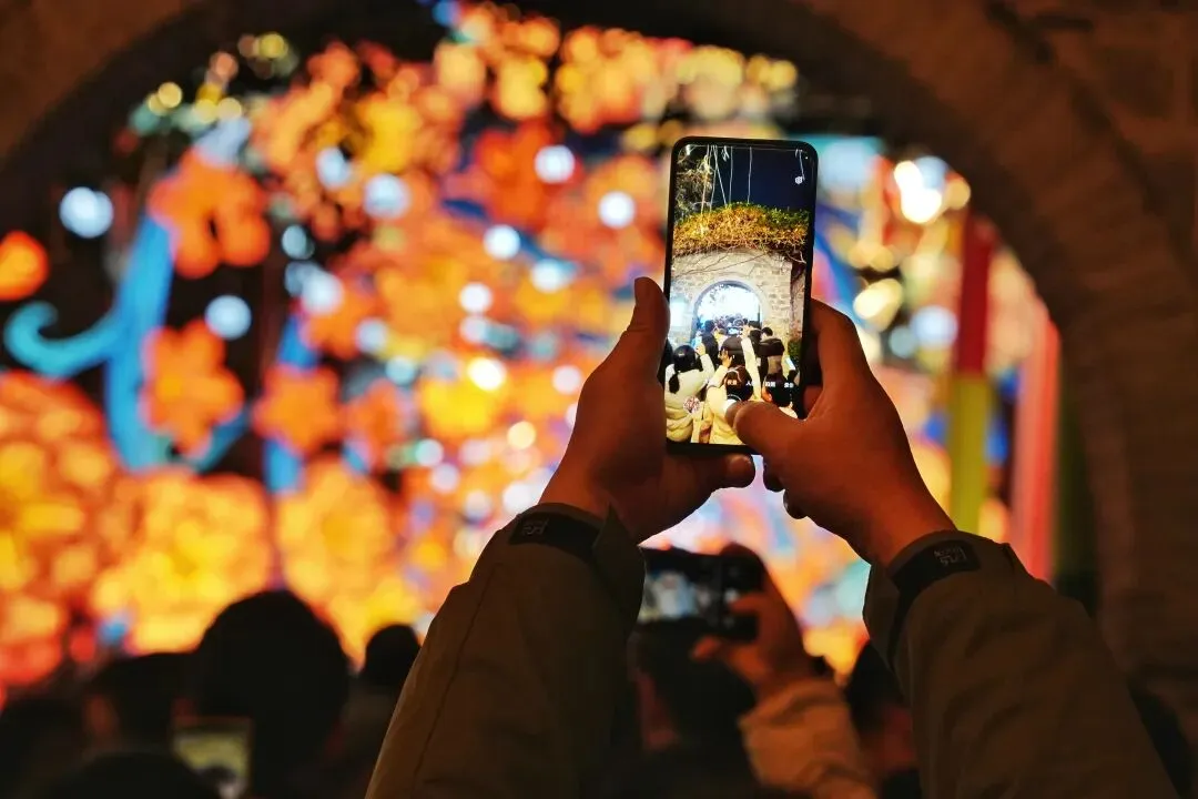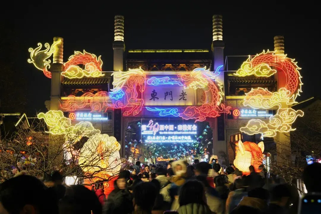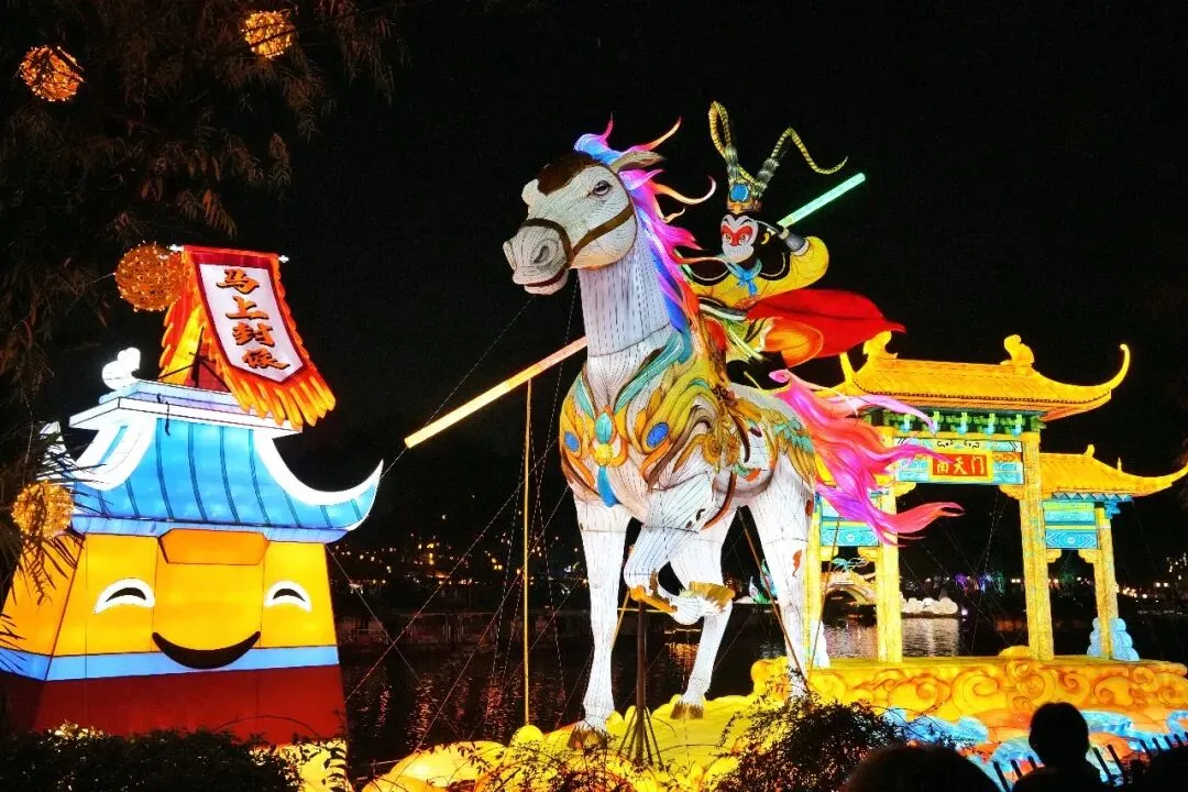 老门东的青石板巷被暮色轻轻笼罩,一排排彩灯顺着屋檐垂落,风一吹便轻轻摇晃,把古巷染得温柔又热闹。巨型主题灯组在夜色降临的瞬间次第亮起,金红交错的飞马灯、金鱼灯、凤凰灯、生肖灯……璀璨绽放流光溢彩,一瞬间便如点亮了整座金陵城。