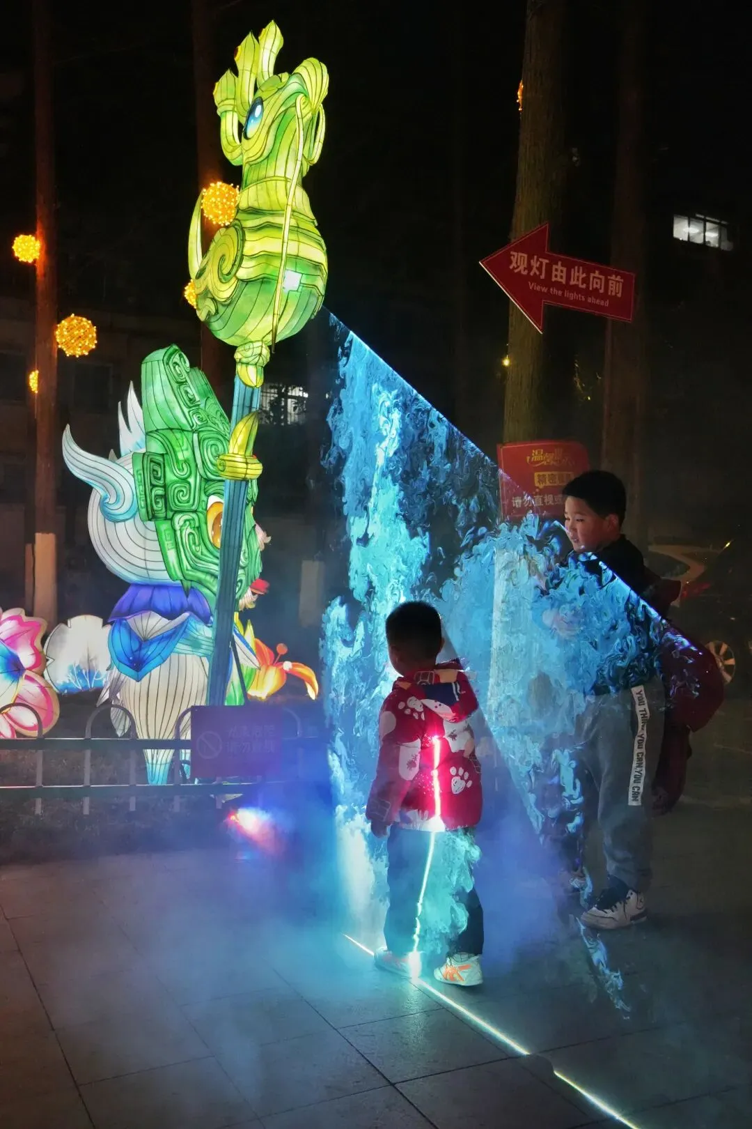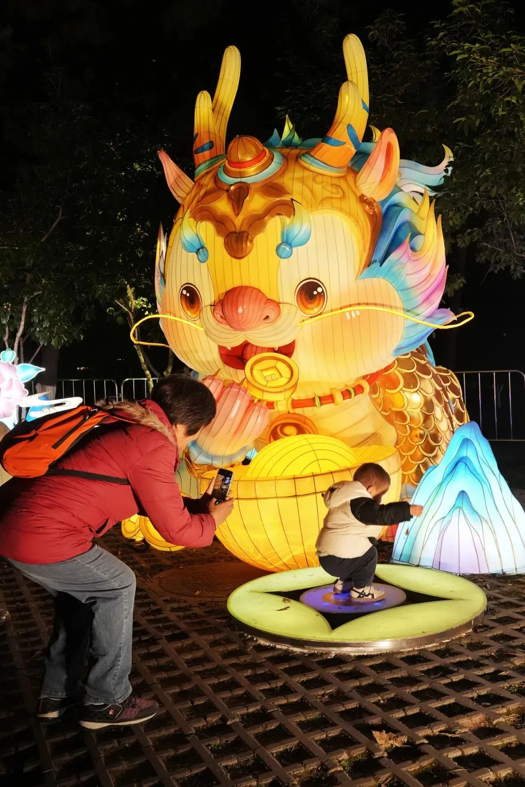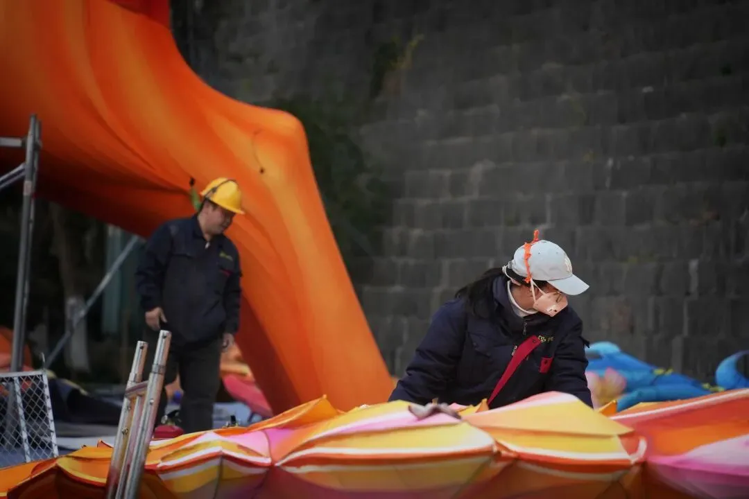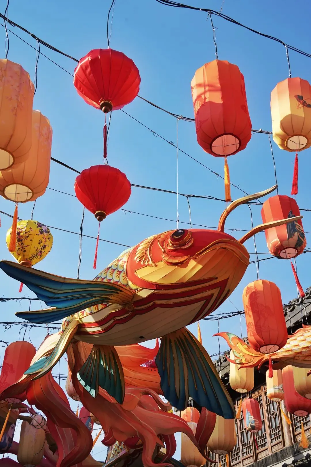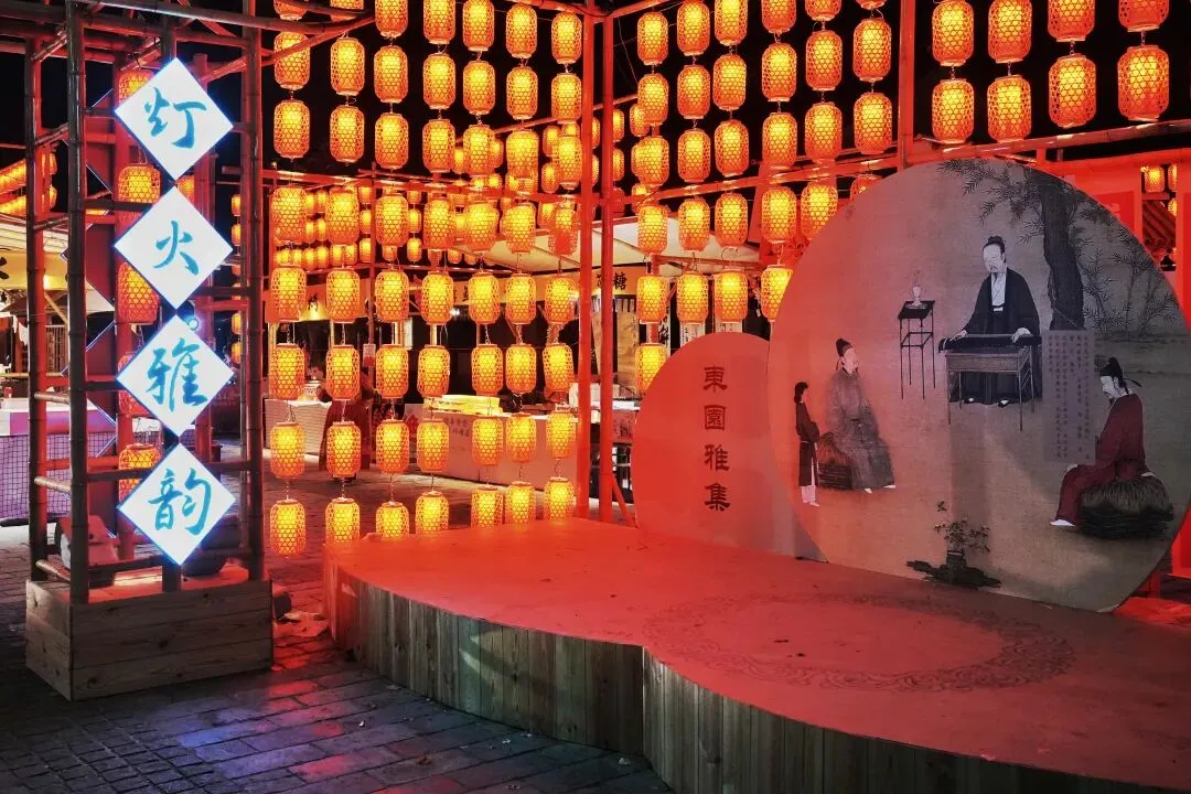 老门东的青石板巷被暮色轻轻笼罩,一排排彩灯顺着屋檐垂落,风一吹便轻轻摇晃,把古巷染得温柔又热闹。巨型主题灯组在夜色降临的瞬间次第亮起,金红交错的飞马灯、金鱼灯、凤凰灯、生肖灯……璀璨绽放流光溢彩,一瞬间便如点亮了整座金陵城。