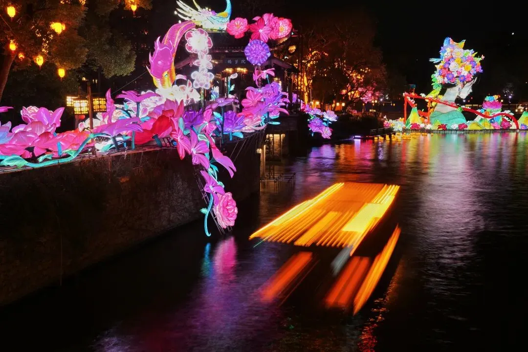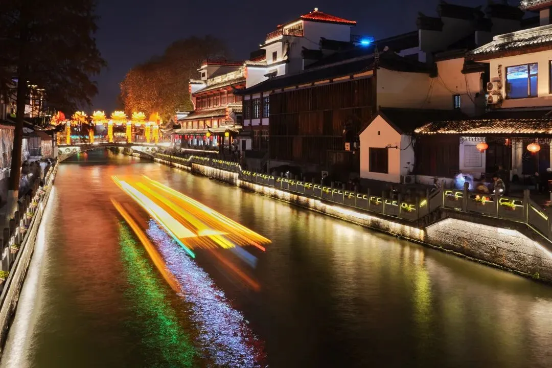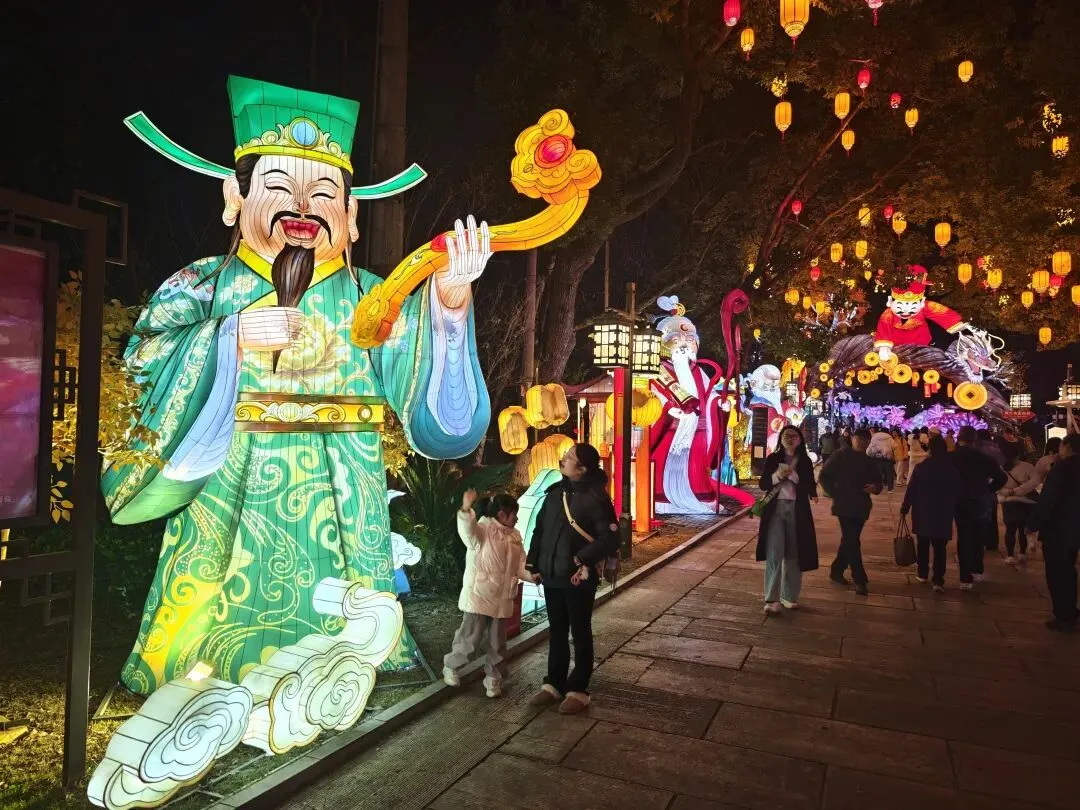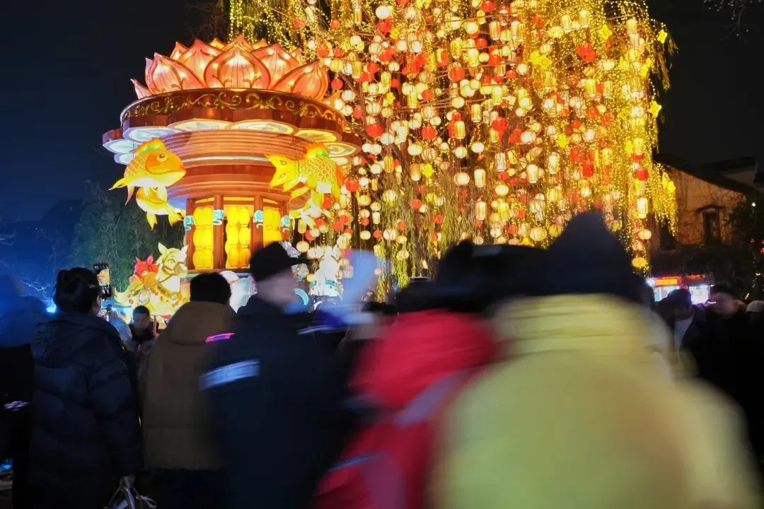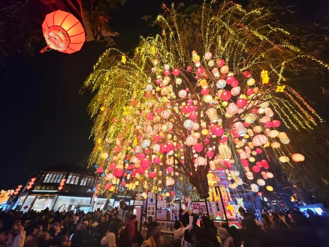祈福灯树上缀满万盏星灯,流光如瀑布般垂落,暖光漫过肩头,游人纷纷举起手机,想把这漫天灯火永远定格。秦淮河上,画舫缓缓穿桥而过,满河灯影被船桨轻轻摇碎,化作一河流动的星光,桨声欸乃,人声喧闹,交织成南京最浓、最暖的年俗烟火气。