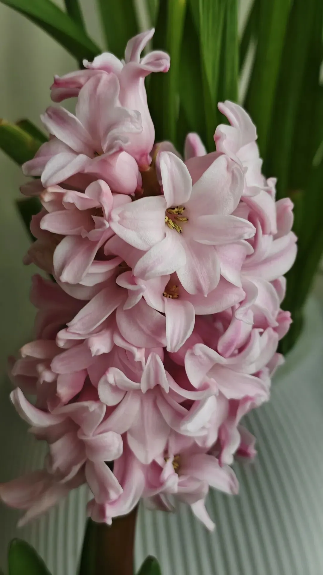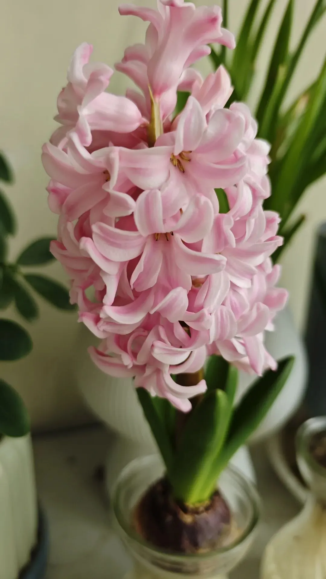 水培的粉色风信子,花朵饱满,叶片翠绿,看起来状态很好。