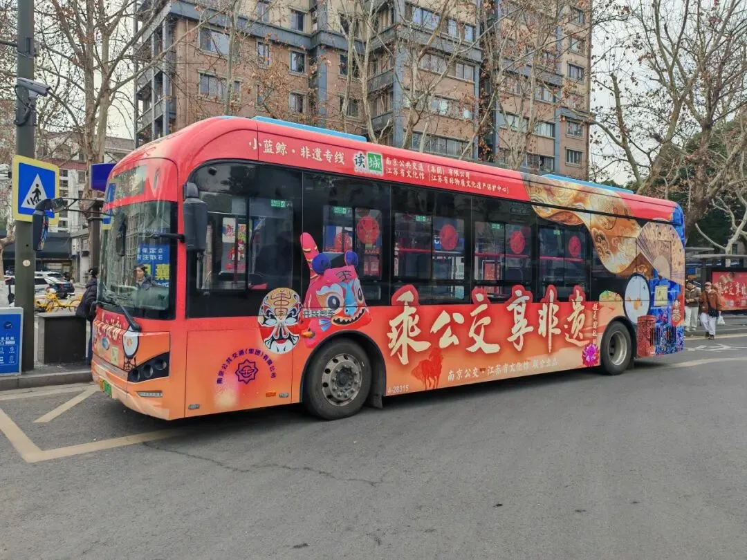 这辆由南京公交与江苏省文化馆联合打造的“读城”公交,以朱红为主色调,祥云流转间点缀蓝印花布与南京剪纸纹样,车身由江苏省文化馆馆长赵彦国手书“乘公交,享非遗”“美的流动”,凝练“读城”核心内涵——以多元载体解读城市历史文脉,让文化在流动中浸润人心。