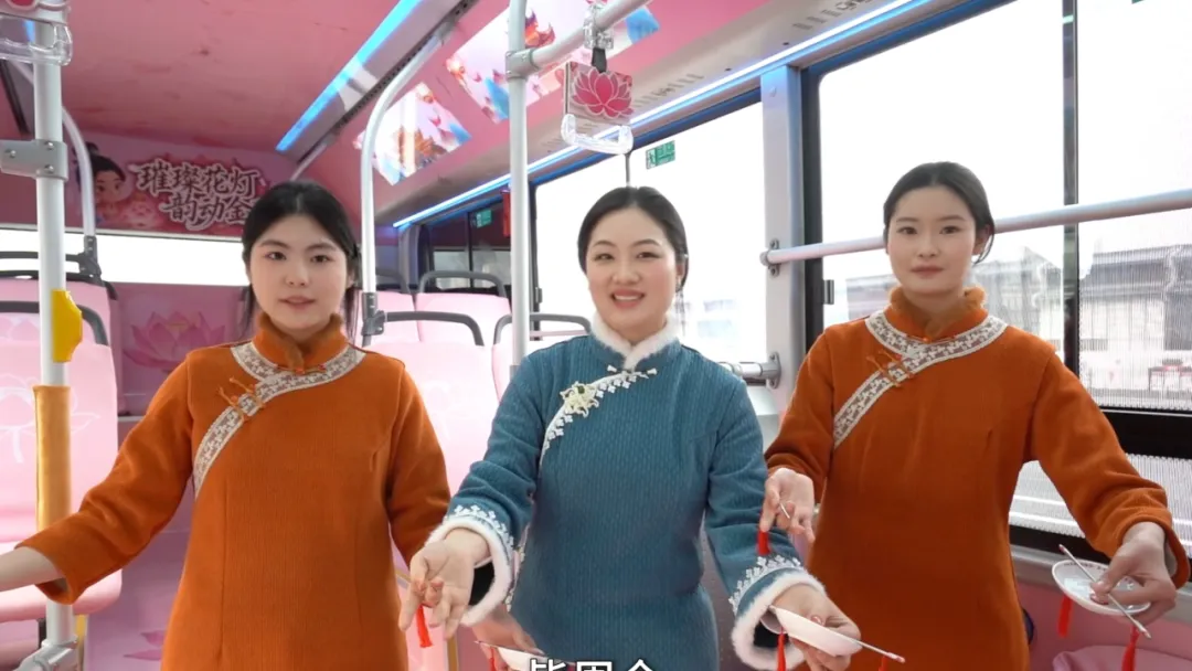 秦淮灯彩,不止于年节的璀璨,公交车头荷花亭亭,车厢花影婆娑。荷花灯纹层层铺展,拉手与座椅皆有花意,带着“张灯祈福”与“和和美美”的美好祝愿,让市民乘客“行在灯中,享在车内”。