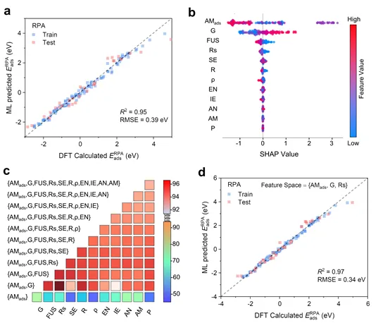 图2.(a)基于RPA泛函吸附能训练的随机森林模型的预测性能。(b)基于训练的随机森林模型的SHAP分析。(c)基于随机森林模型的特征组合筛选过程。(d)使用{AM_ads,G,Rs}特征组合的随机森林模型的预测性能。