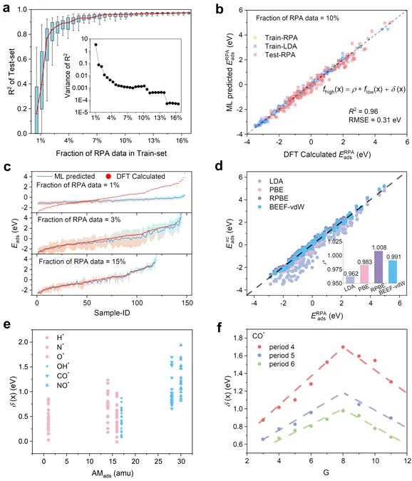 研究还系统分析了不同交换关联泛函与RPA之间的映射关系,揭示了低阶泛函在CO、NO等吸附体系中误差显著放大的规律,为后续高精度数据的针对性补充提供了指导。该框架不仅适用于传统过渡金属表面,也有望推广至更复杂的合金表面催化体系,为构建快速、低成本且具备物理可解释性的材料筛选平台奠定基础。