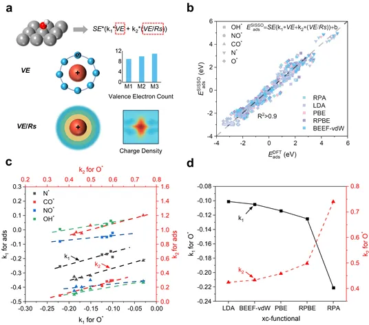 图4.(a)SISSO吸附能公式描述符VE和VE/Rs。(b)不同泛函下的吸附能的SISSO统一公式。(c)不同小分子与O*之间的描述符权重系数的线性标度关系。(d)不同泛函的描述符的权重系数。