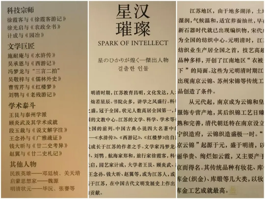 南京的魅力,从不只在于千年历史的沉淀,更在于文化星光的璀璨。漫步南京博物院“明清辉煌”展区,仿佛穿越时空,窥见当年“盛世江南”的繁华——明清时期,江苏经济富庶,文化鼎兴名人辈出,佳作不断。中国古典小说四大名著中,《水浒传》《西游记》《红楼梦》皆与江苏有着深厚渊源。施耐庵、吴承恩、曹雪芹,或生于此,或长于此,在江南的灵秀之气中汲取灵感,写下了流传千古的文学经典,滋养着一代又一代人。明代“吴门四家”的清雅笔墨,清初“金陵八家”的苍劲风骨,“四王恽吴”的精工细作,“四僧”的孤高奇崛,清代中叶“扬州八怪”的不拘一格;郑和扬帆远航,遍历西洋,开辟了中外交流的新纪元;徐霞客踏遍名山大川,以脚步丈量山河,著成《徐霞客游记》;徐光启潜心治学,融汇中西,在科学领域留下不朽成就;计成深耕园林艺术,著《园冶》一书,奠定中国园林美学的根基;顾炎武心怀天下,“天下兴亡,匹夫有责”的呐喊,穿越千年依旧振聋发聩。