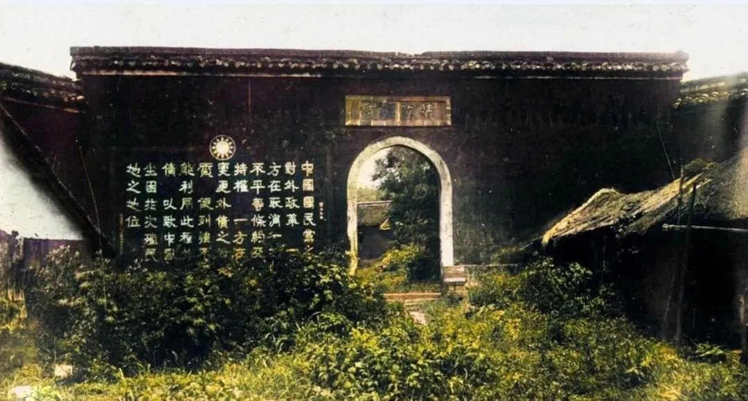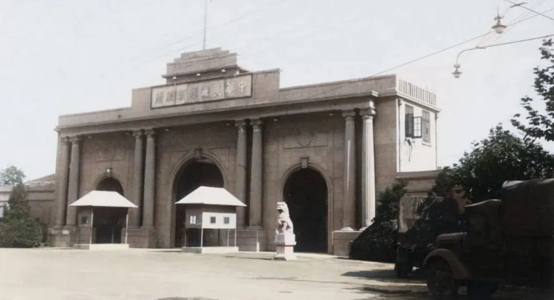 这个三拱门的西式门廊是南京总统府旧影,立柱粗壮,门楣上“中华民国维新政府”的字样还在,门口立一尊石狮,阴影压得广场发白,那会儿旗子还没换色,空气里已经有风声了。