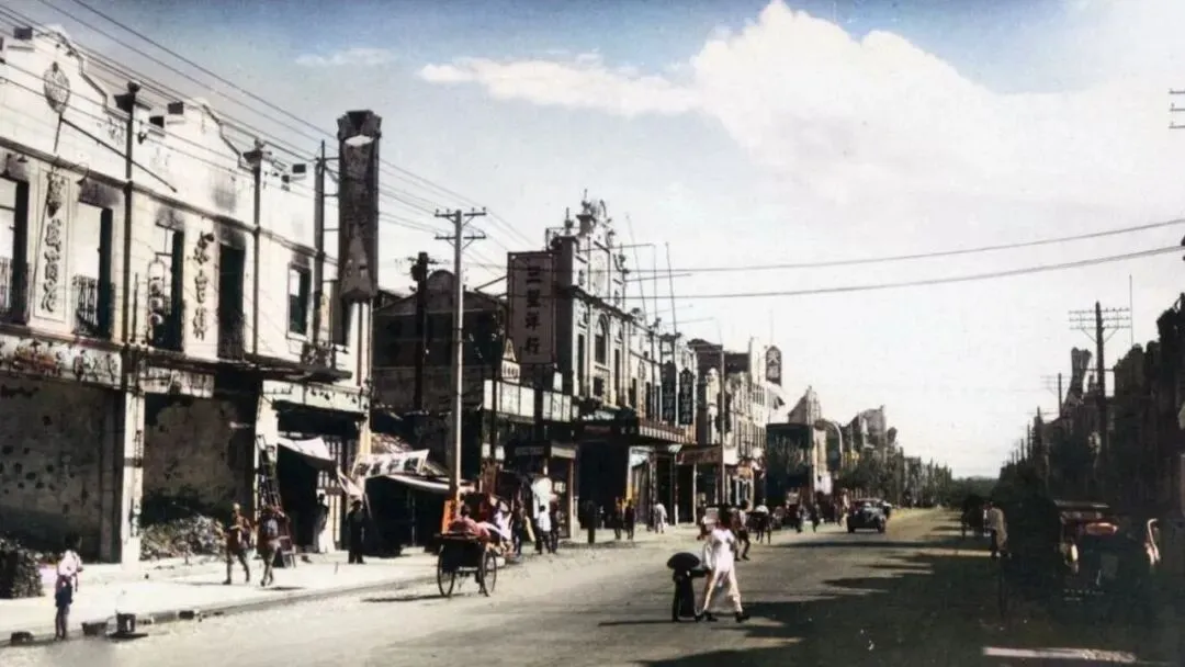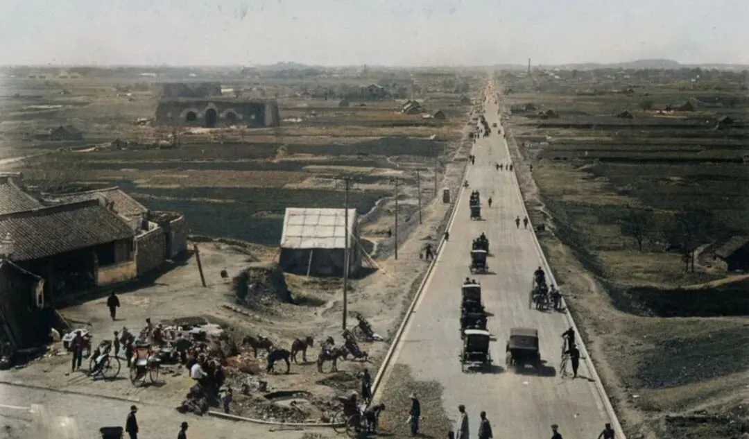 这条笔直铺开的大道叫中山东路,镜头从高处俯下去,马车、自行车、黄包车一股脑儿往前奔,路边田垄还潮着泥,远处门洞像块黑印子,城和乡在同一条线上拉扯,那时候修一段路就像给城市续一口气。