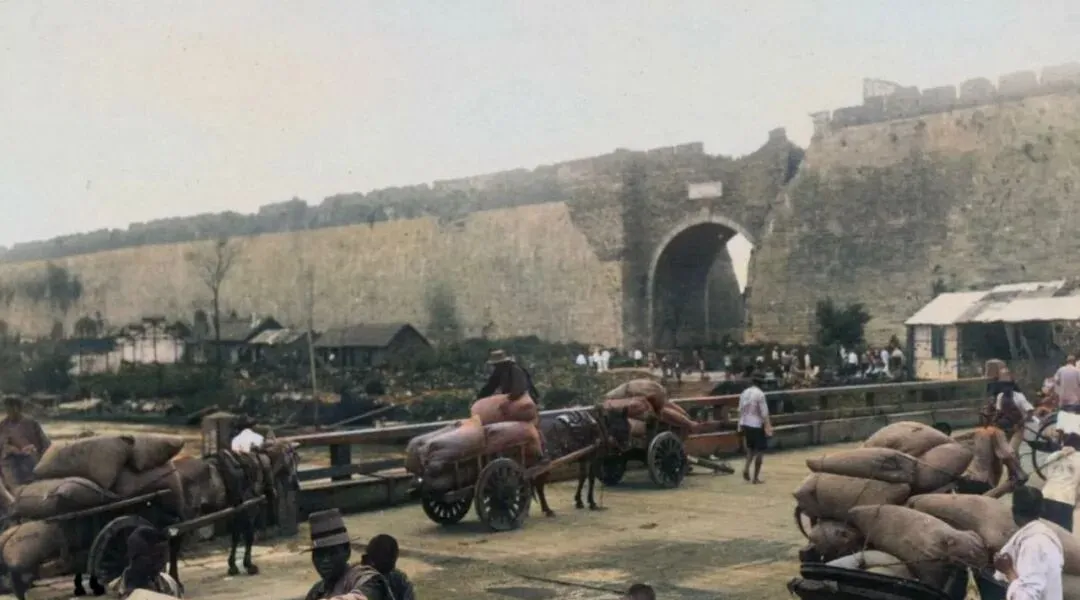 这处热闹的是中华门外的集散地,大包小包堆在车上,人牵着牲口缓缓过去,门洞像一张张紧的嘴,进城要等,出城也要等,守着规矩,谁都不敢乱闯。