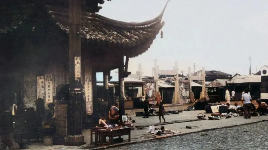 这座飞檐挂角的小亭连着夫子庙的市集,柱子上贴了对联,地上摊着古玩零碎,铜钱、纸票、旧匣子,卖主坐在小凳上,拿蒲扇拨拉灰,掀开就给你看个真真假假。