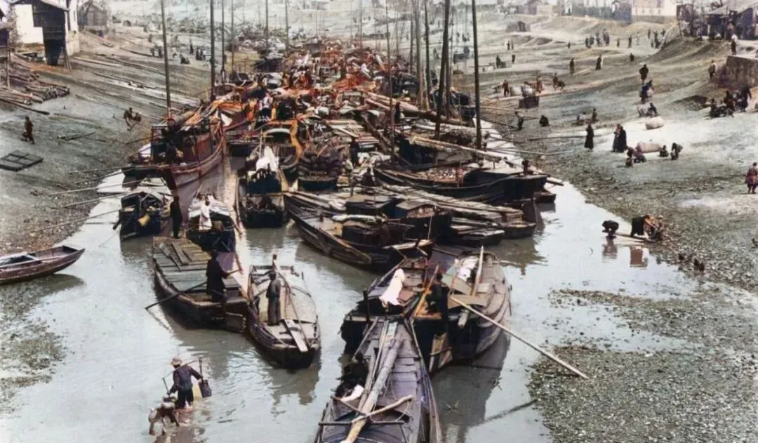这张枯水时的秦淮河口,船像一串串梭子挤在沟里,人下了河滩捡拾东西,孩子提着裤脚追着水纹跑,嘈杂一团,却不乱,谁都知道自个儿该站哪儿。