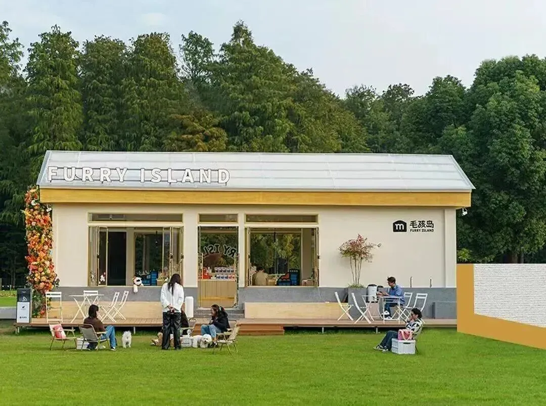 室内咖啡馆提供宠物冰激凌,室外草坪设置露营社交区,更有专属“狗狗公园”配备趣味设施。