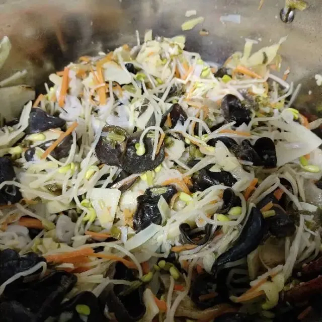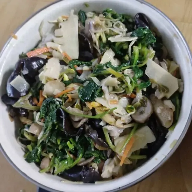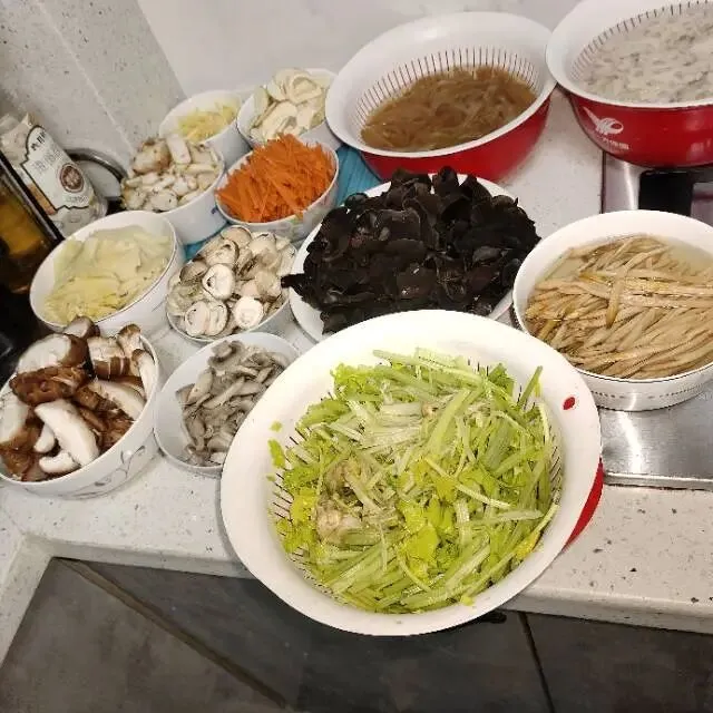 小时候,每到过年,爸爸都会准备一盆什锦菜,没错,一盆,一大盆。十六七岁的时候,爸爸就把炒什锦菜这件事,交给我了,不知不觉,我已经干了三十五六年了。现在,再做这件事,真是驾轻就熟,游刃有余。一周前,就开始准备,买食材,冬笋,雪菜,腌生姜片,酱瓜,耐储的先买,荠菜,菠菜,芹菜,需要细心摘拣的,稍迟两天买,豆芽,草菇,不耐储存的,要炒菜的当天买。今天,炒什锦菜,早起,先把木耳,黄花菜用水泡上,然后洗菜,切菜,胡萝卜,冬笋,荸荠,分别切丝切片,菠菜荠菜多洗洗,沥干水备用,酱瓜,姜片切好。做完这些,准备工作基本完成。