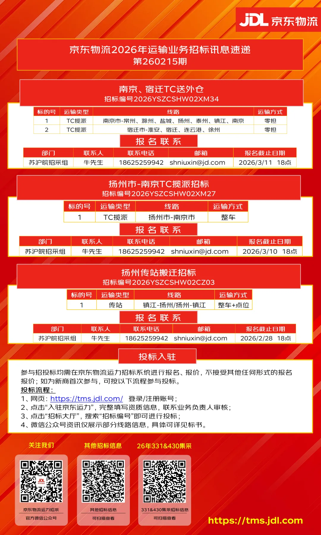 报名方式1、网页:https://tms.jdl.com/ 登录/注册账号;2、点击“入驻京东运力”,完整填写资质信息,联系业务负责人审核;3、点击“招标大厅”,搜索“招标编号”即可进行投标。本宣传资料为投标邀请,所示图片及文字仅供参考,不作为招标人向投标人发出之投标标的及入围承诺,不属于合同内容。本宣传资料制作时间详见发布日期。本公司保留对宣传资料修改的权利,敬请留意最新资料。本信息最终解释权归京东物流运力平台部所有。