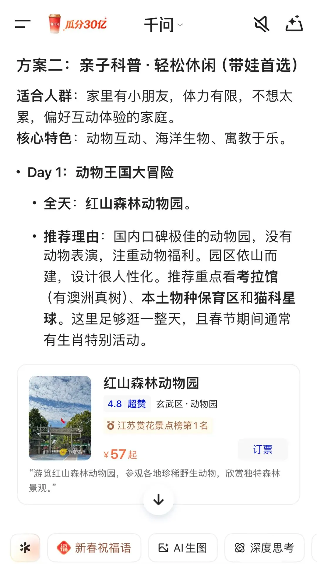 原本70⼀张的红⼭动物园节假⽇⻔票,⽤千问AI买票只需45就能与顶流杜杜⾯对⾯交流;